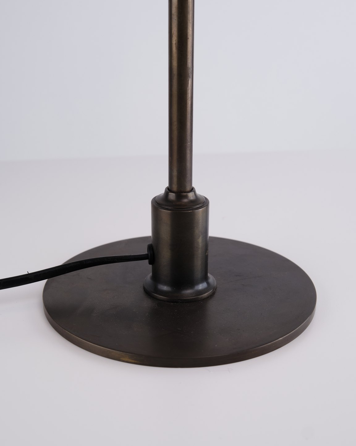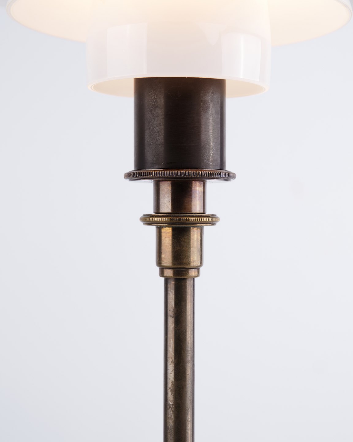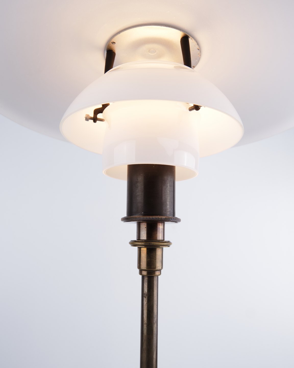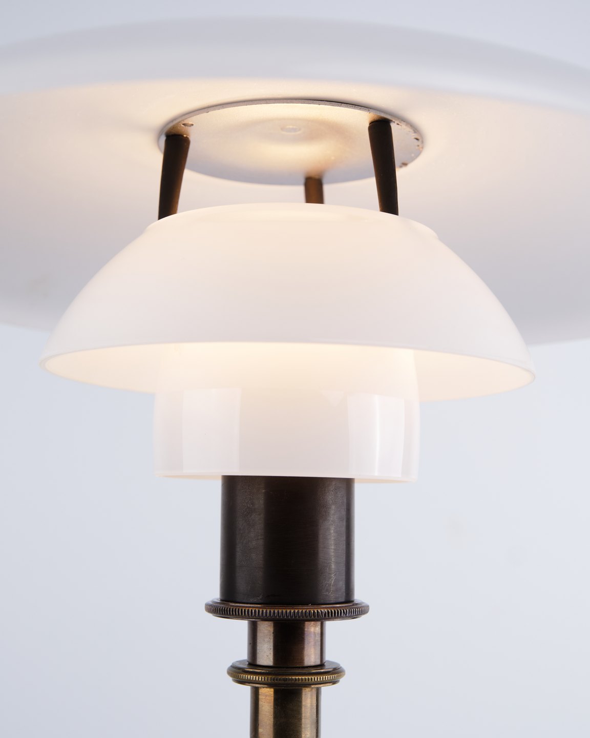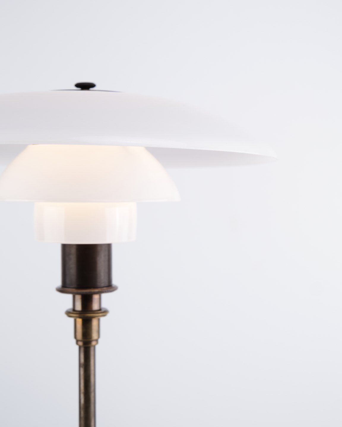 PH 3/2 Treph table lamp designed by Poul Henningsen and released as an anniversary model in 1994 by Louis Poulsen. The lamp is made with a burnished frame and classic shades in white opal glass, ensuring a soft and glare-free light. The iconic three-shade system is developed for optimal light distribution and is a central element in Henningsen’s design philosophy.