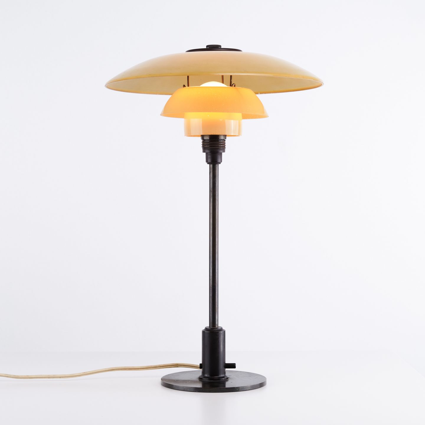 PH 3/2 table lamp designed by Poul Henningsen and produced by Louis Poulsen in the 1930s. The lamp is made with single-layer yellow painted shades, providing a warm and pleasant light. The iconic three-shade system is developed to ensure optimal light distribution and minimize glare.