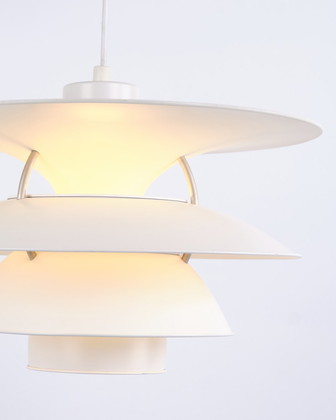 Charlottenborg pendel, model PH 5-4½, designet af Poul Henningsen og fremstillet af Louis Poulsen i 1980’erne. Lampen er baseret på det 4-skærmssystem, som blev introduceret i 1931 med det formål at øge lysudbyttet og skabe mere effektiv belysning i rummet. Konstruktionen sender en større mængde lys vandret ud, hvilket giver bedre oplysning af vægge og omgivelser sammenlignet med traditionelle 3-skærmslamper.