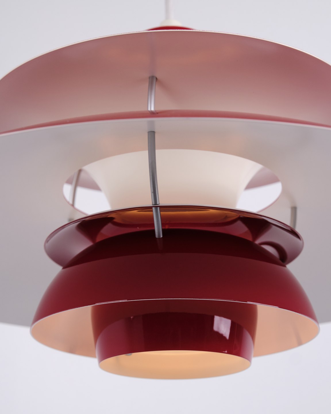 PH 5 pendel i rødlakeret metal fra Louis Poulsen designet af Poul Henningsen. Klassisk dansk lampe med blændfrit og funktionelt lys.