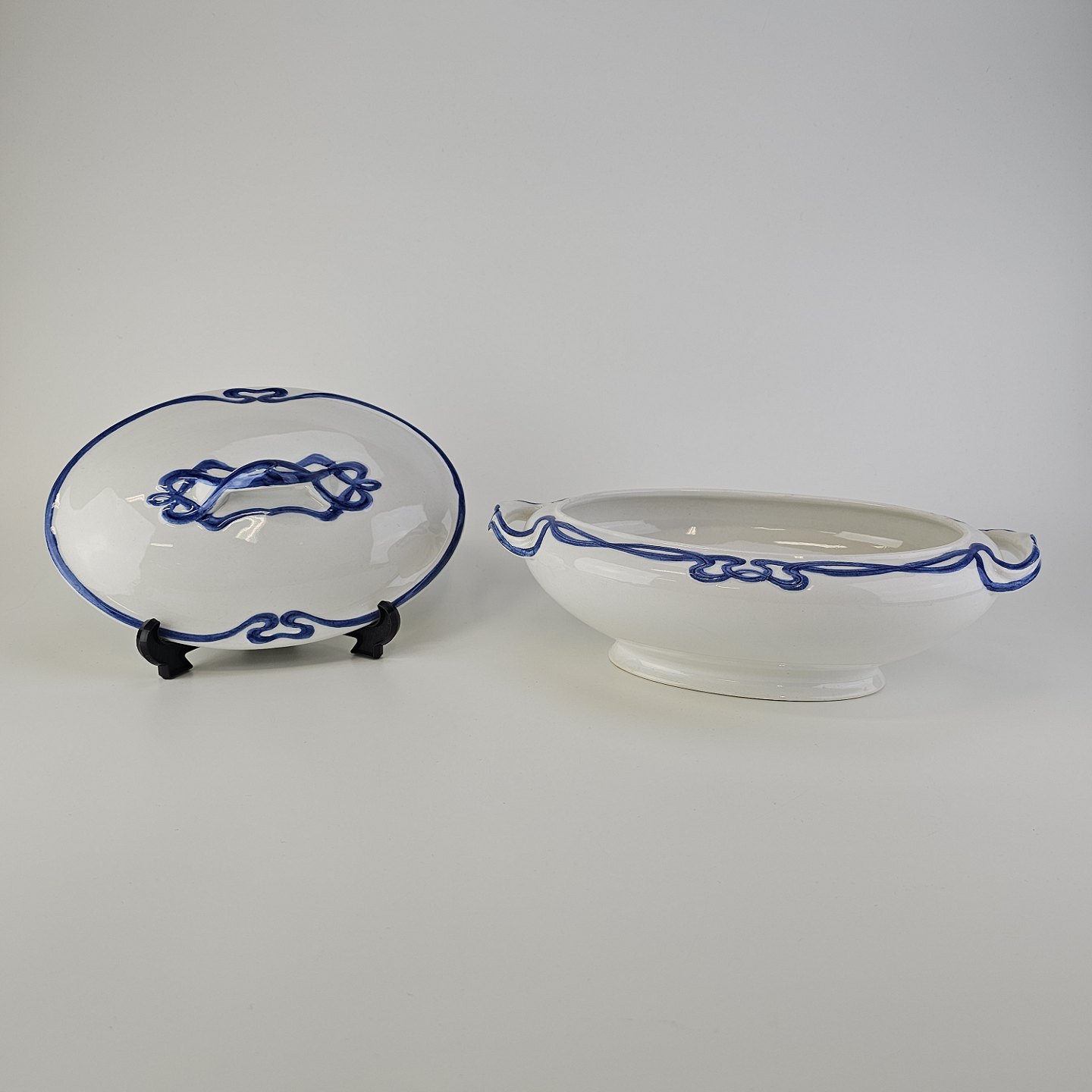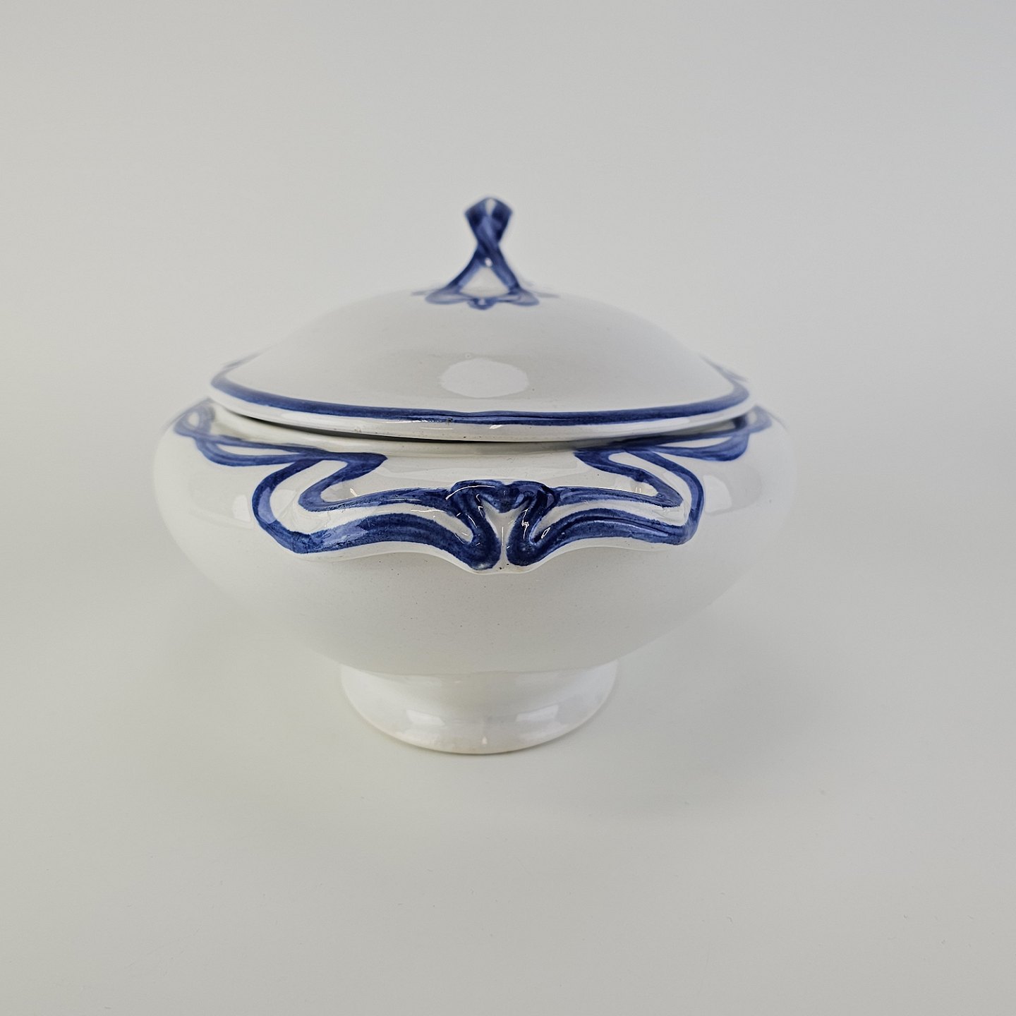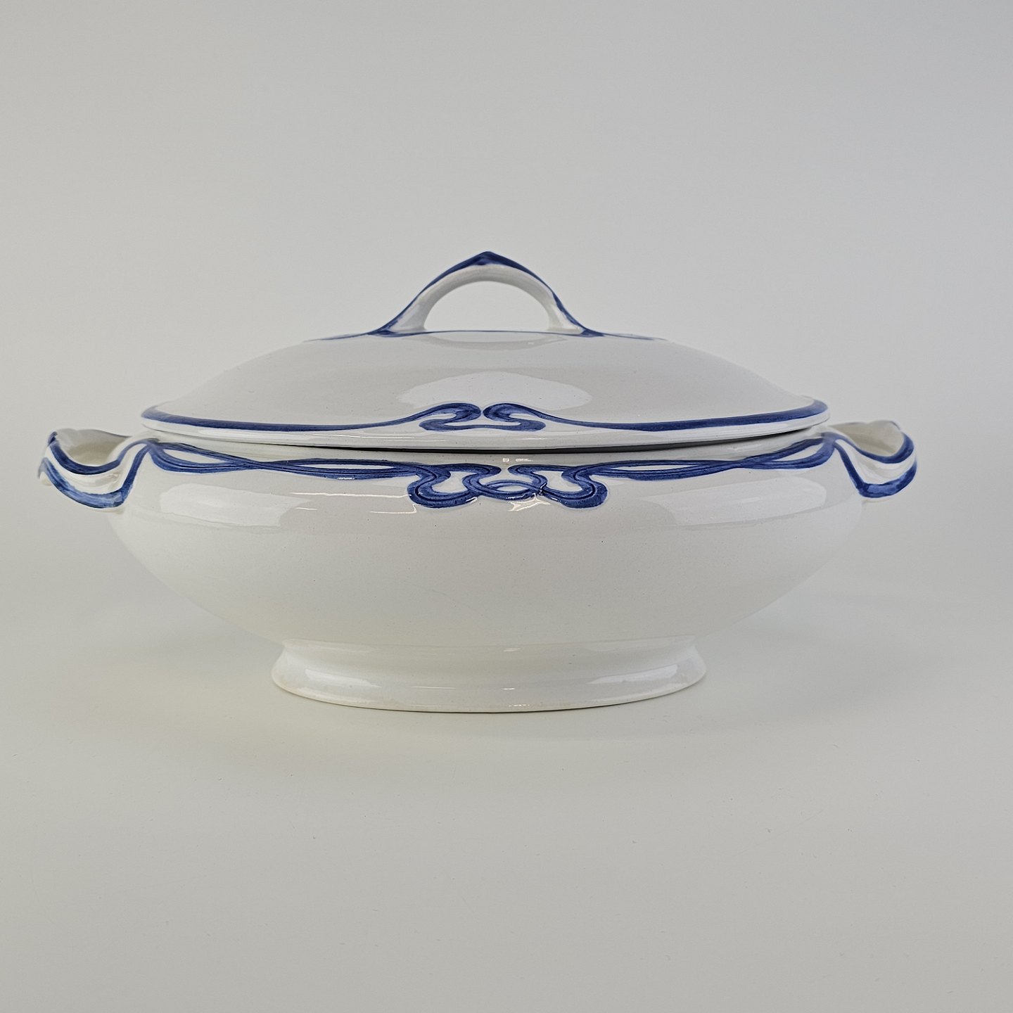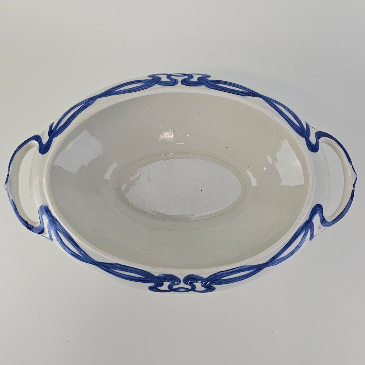 Blå Olga er hvid fajance dekoreret med blå abstrakt mønster langs kanten