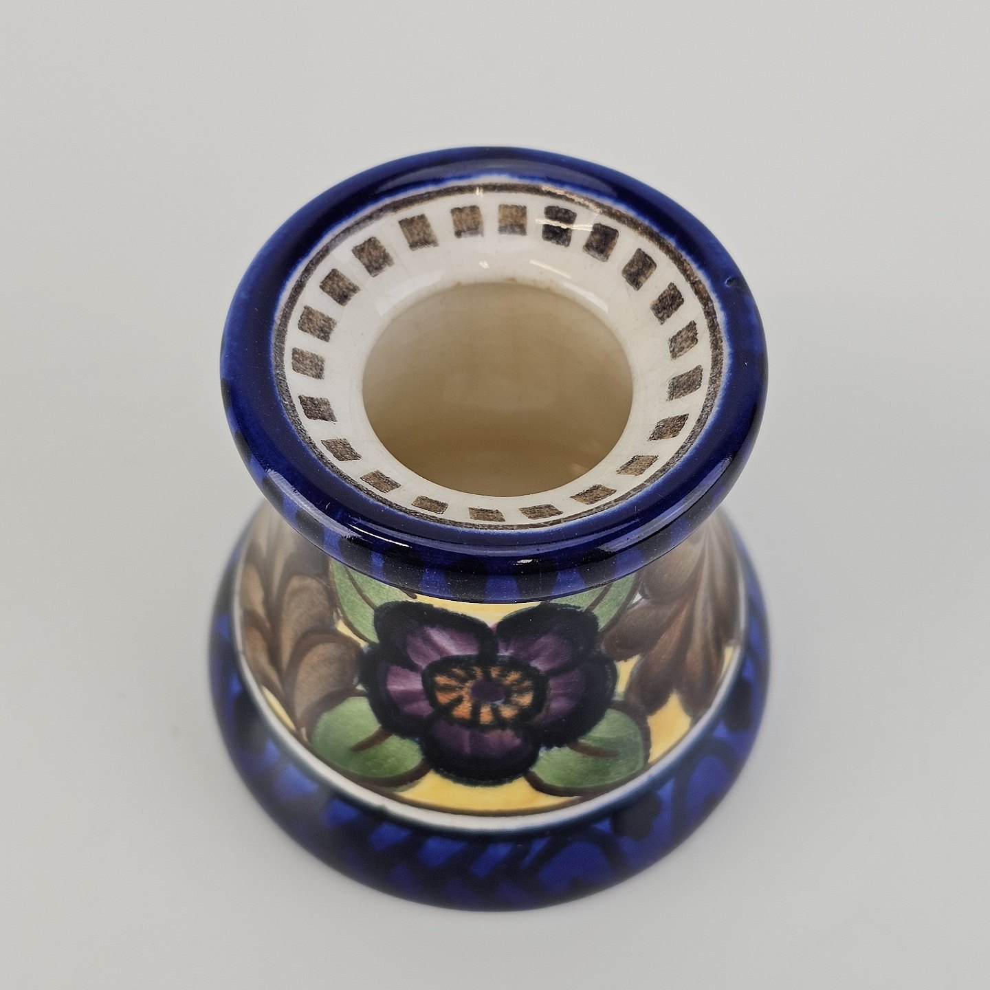 Blækhus i fajance med dekoration af blomster og blå kant