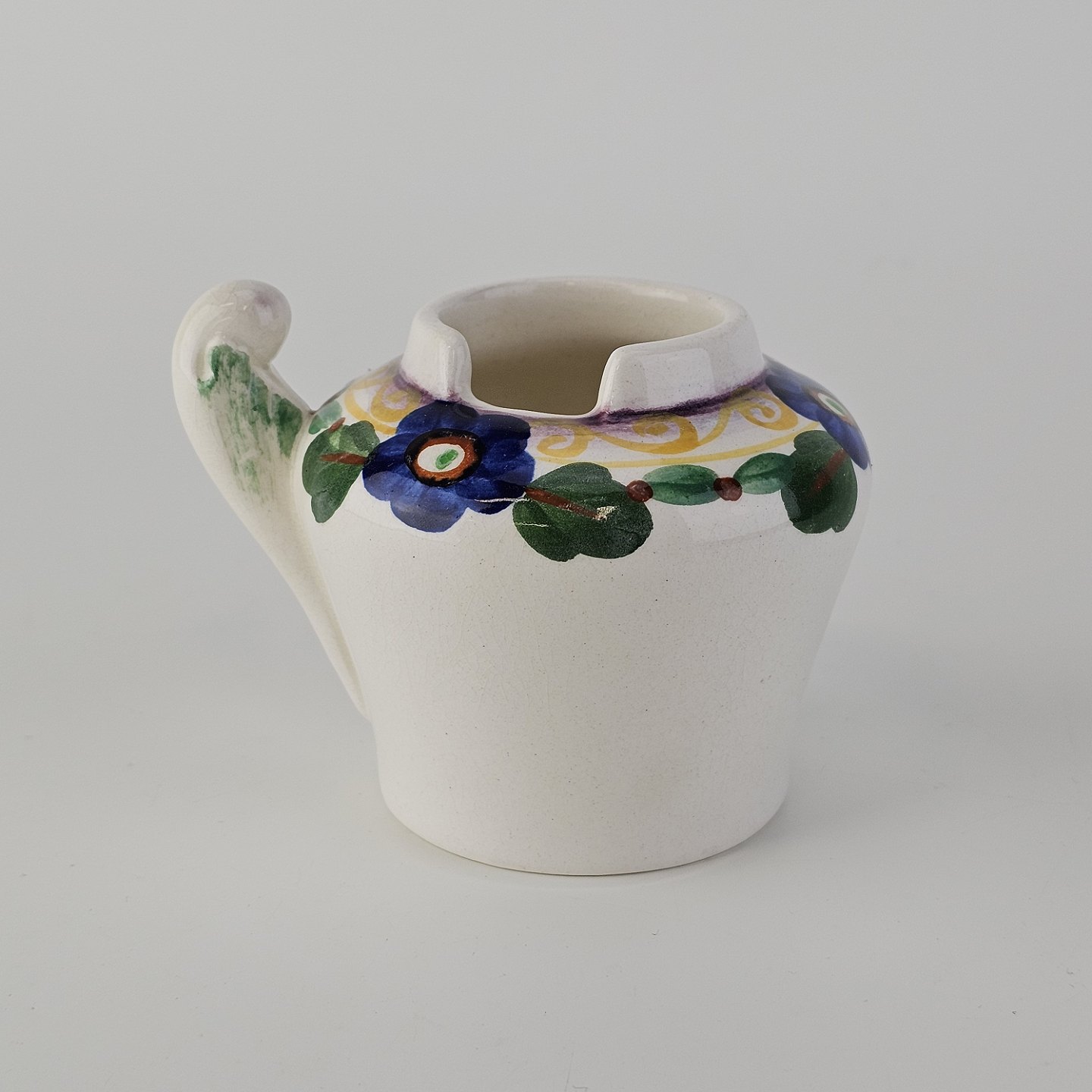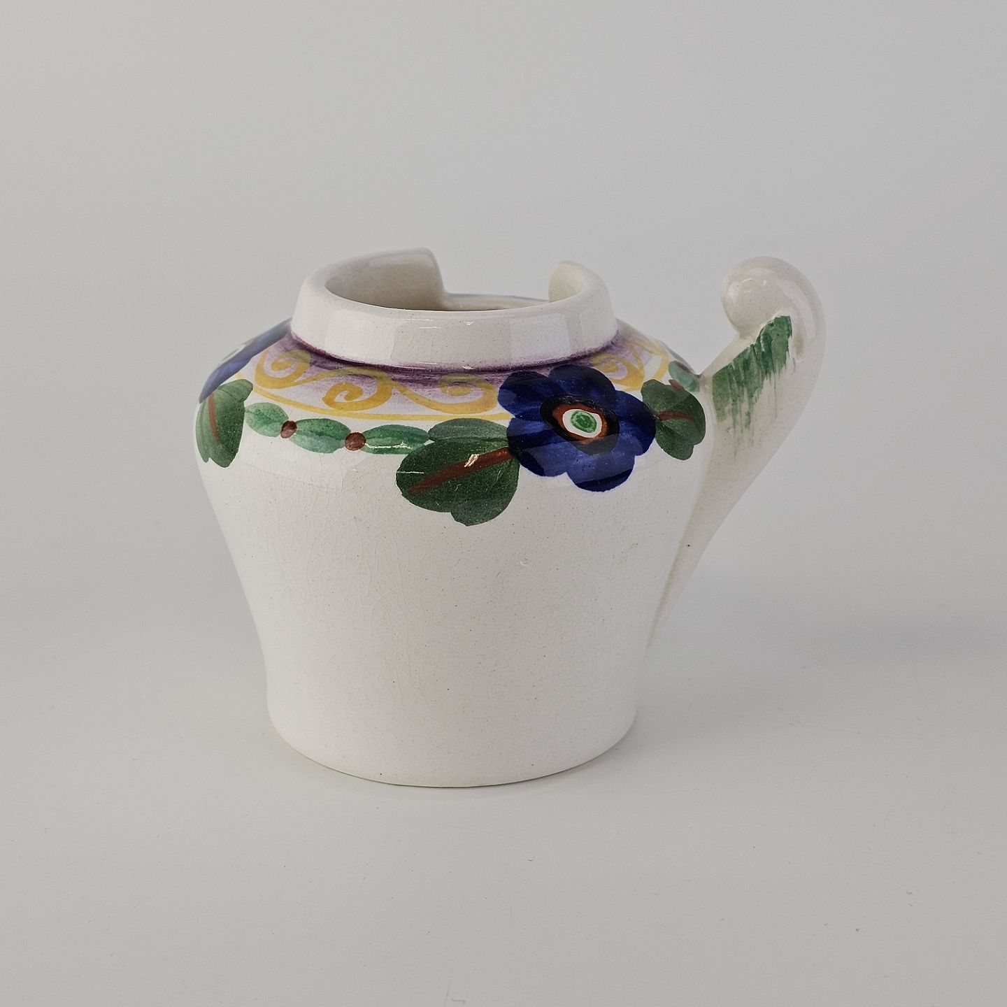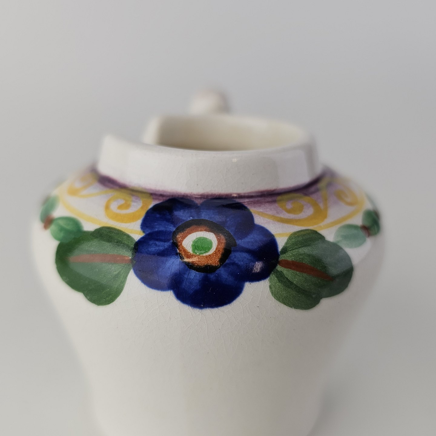 Stellet er i hvid fajance og håndmalet med dekoration af blå violer