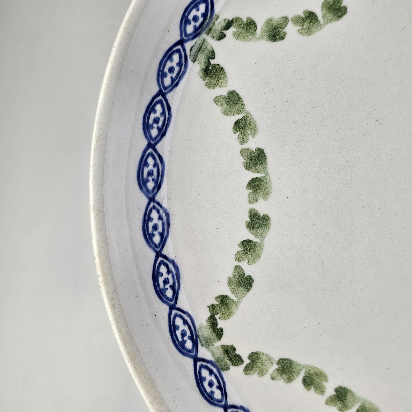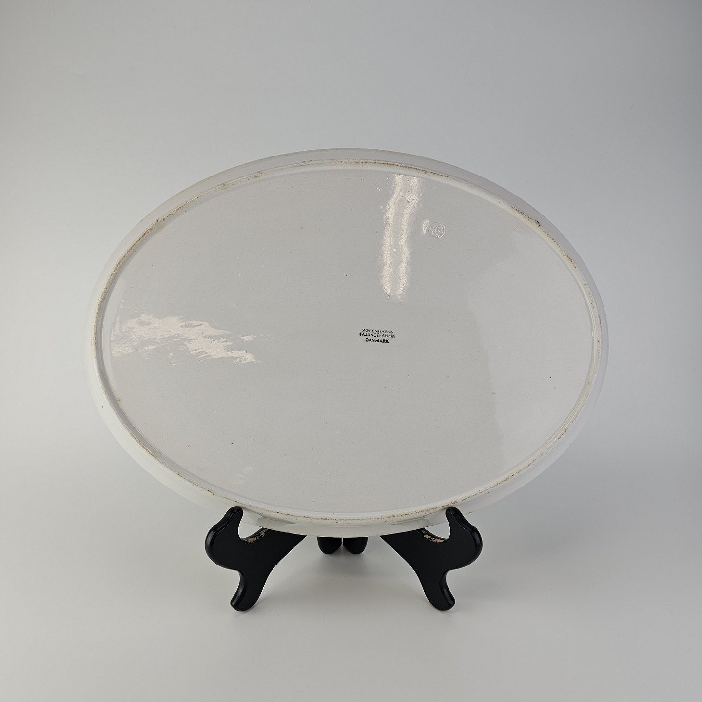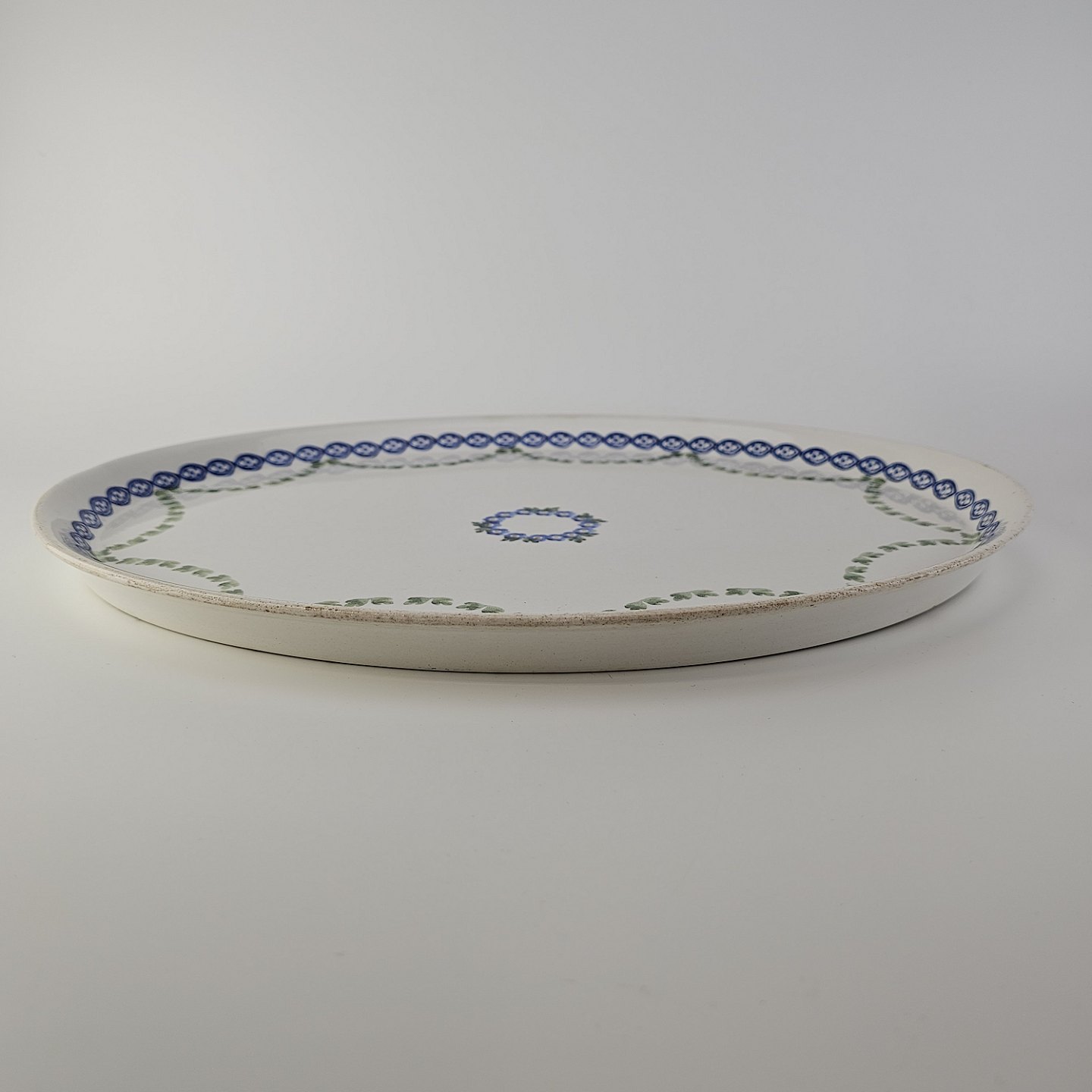 Ovalt fad fra stellet Kærminde i hvid fajance med blå dekoration