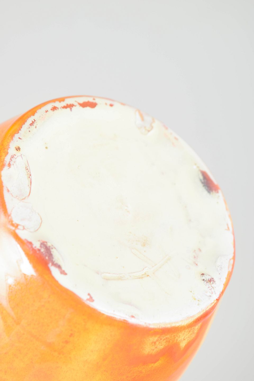 Elegant vase i glaseret lertøj med blød, let konisk form og svagt udadbøjet rand. Udført i lys gul glasur med varme orange nuancer og fine lodrette løb, der giver et levende og organisk udtryk. Signeret HAK i bunden.