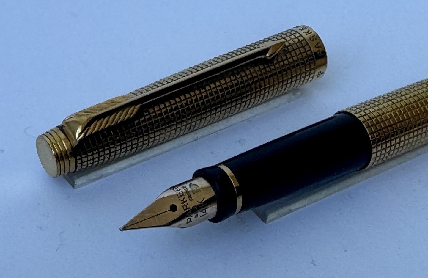 Parker 75 Cicelé fyldepen med ternet mønster på overflade i guld-double. Fremstillet i U.S.A. i 1970’erne. Fuldt funktionsduelig. Fin overflade uden stød eller andre overflade brugsspor. Har dog brug for at blive pudset. For enden en 14 karat 585 guldspids fremstillet i Frankrig. L. 13 cm.