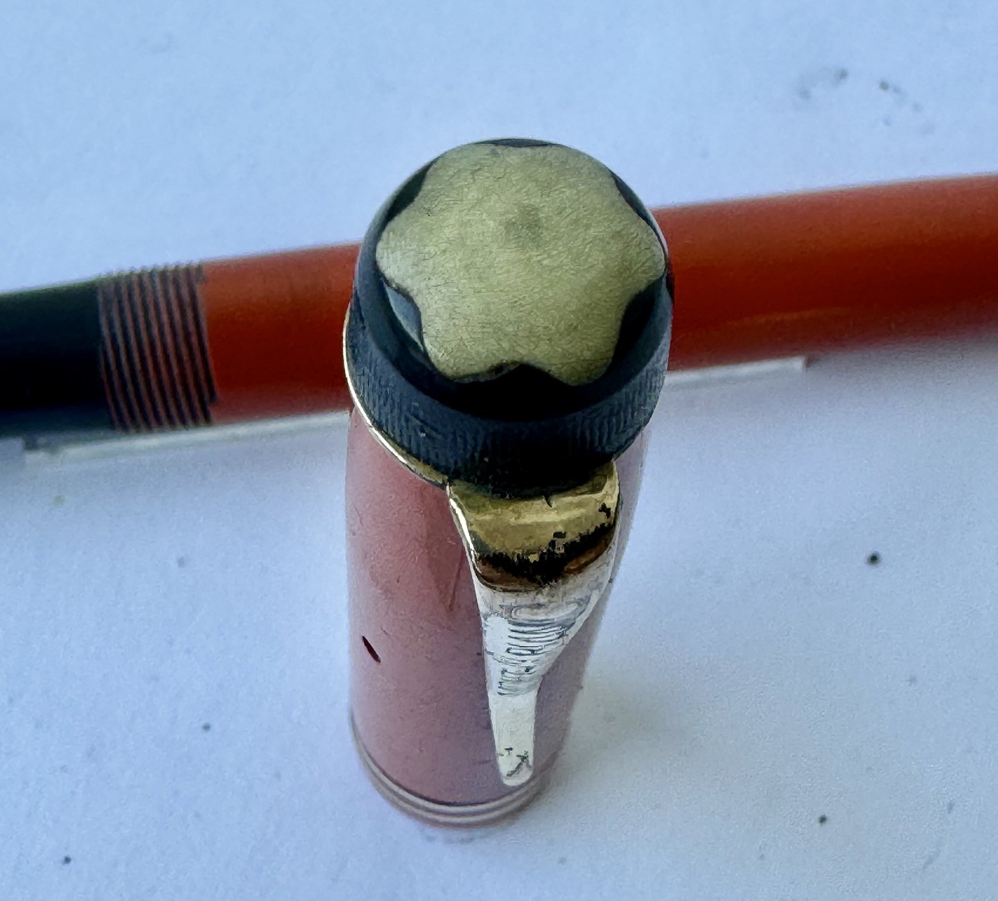 Coral red Montblanc Simplo Masterpiece no. 20 fountain pen. Push button filler. Produced inthe 1930s in Denmark. Slightly faded factory logo on the “body”. The end of the clip is broken. Otherwise no damage or repairs. All parts are original Montblanc from the period including the beautiful 14 carat gold nib. The fountain pen does not work. Dimensions: L. 13 cm
