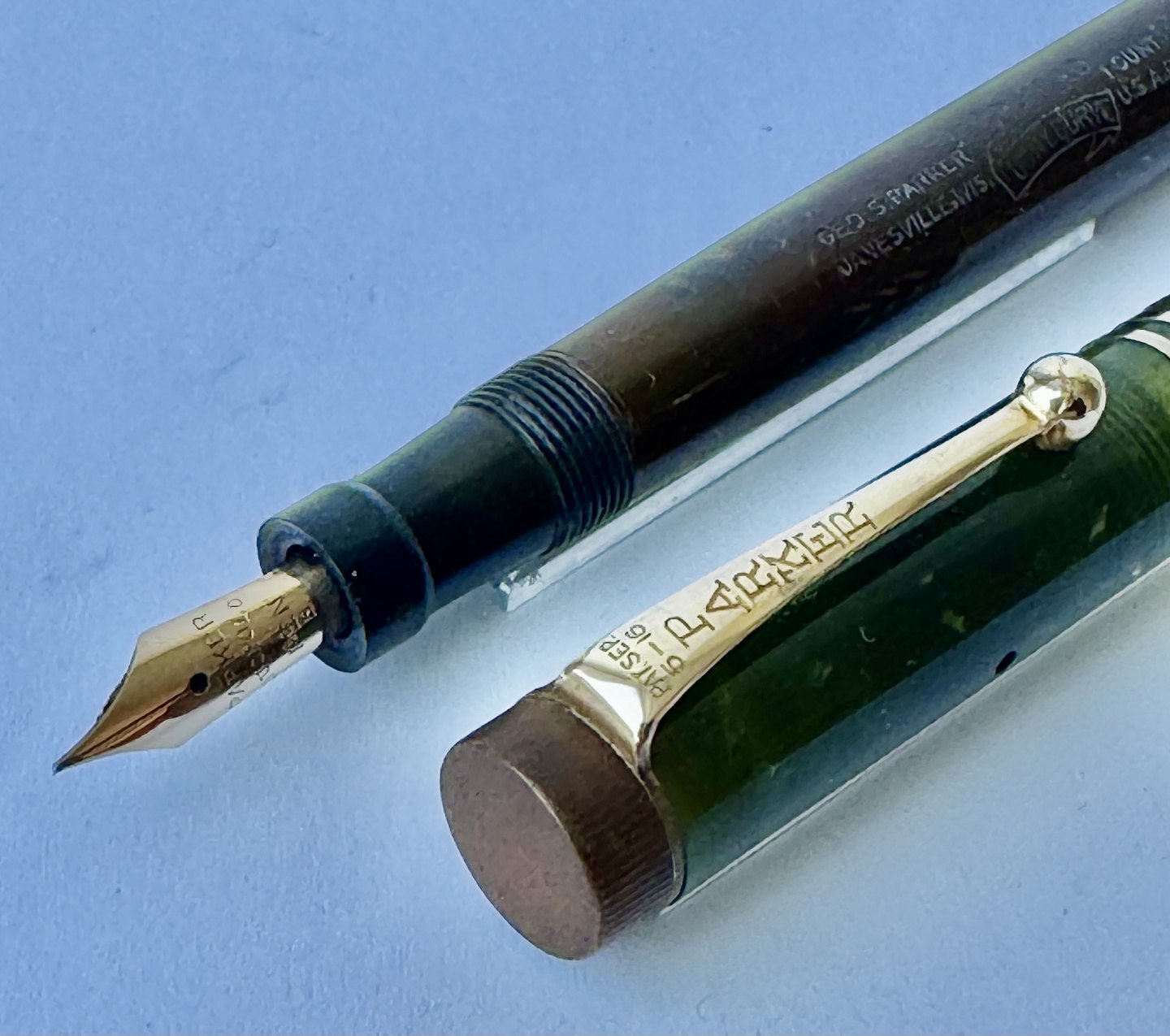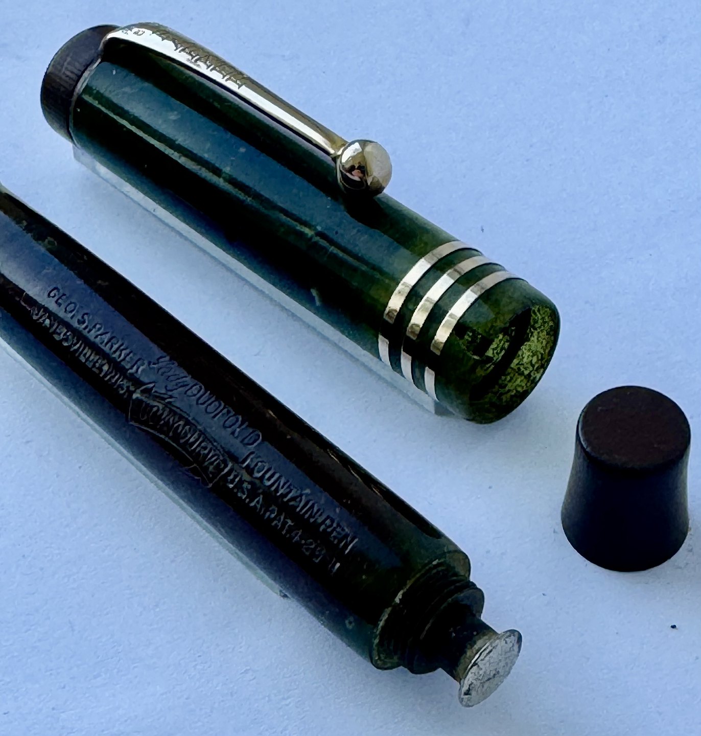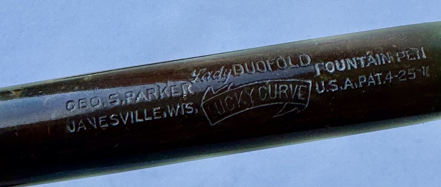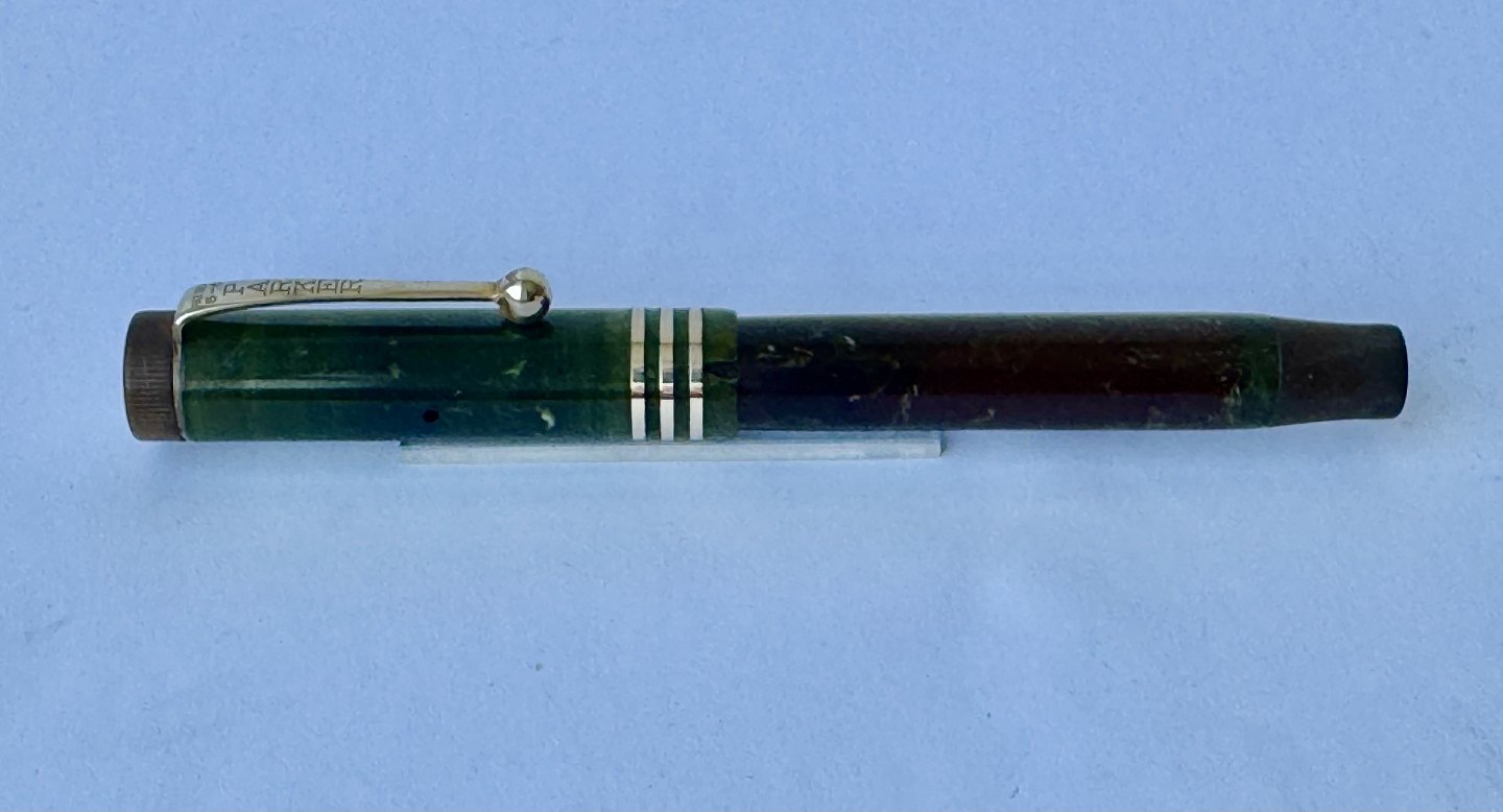 Kort grøn marmoreret Lady Parker Duofold Lucky Curve fyldepen fra omkring 1930. Har et stort skår på hættens åbning, kant. Ellers ingen skader eller reparationer. Push button blæk-påfylder. Der skal indsættes en ny gummisæk før end fyldepennen igen kan optage blæk og skrive.
