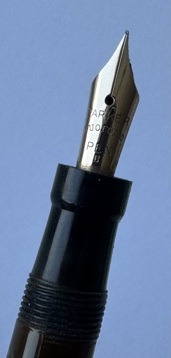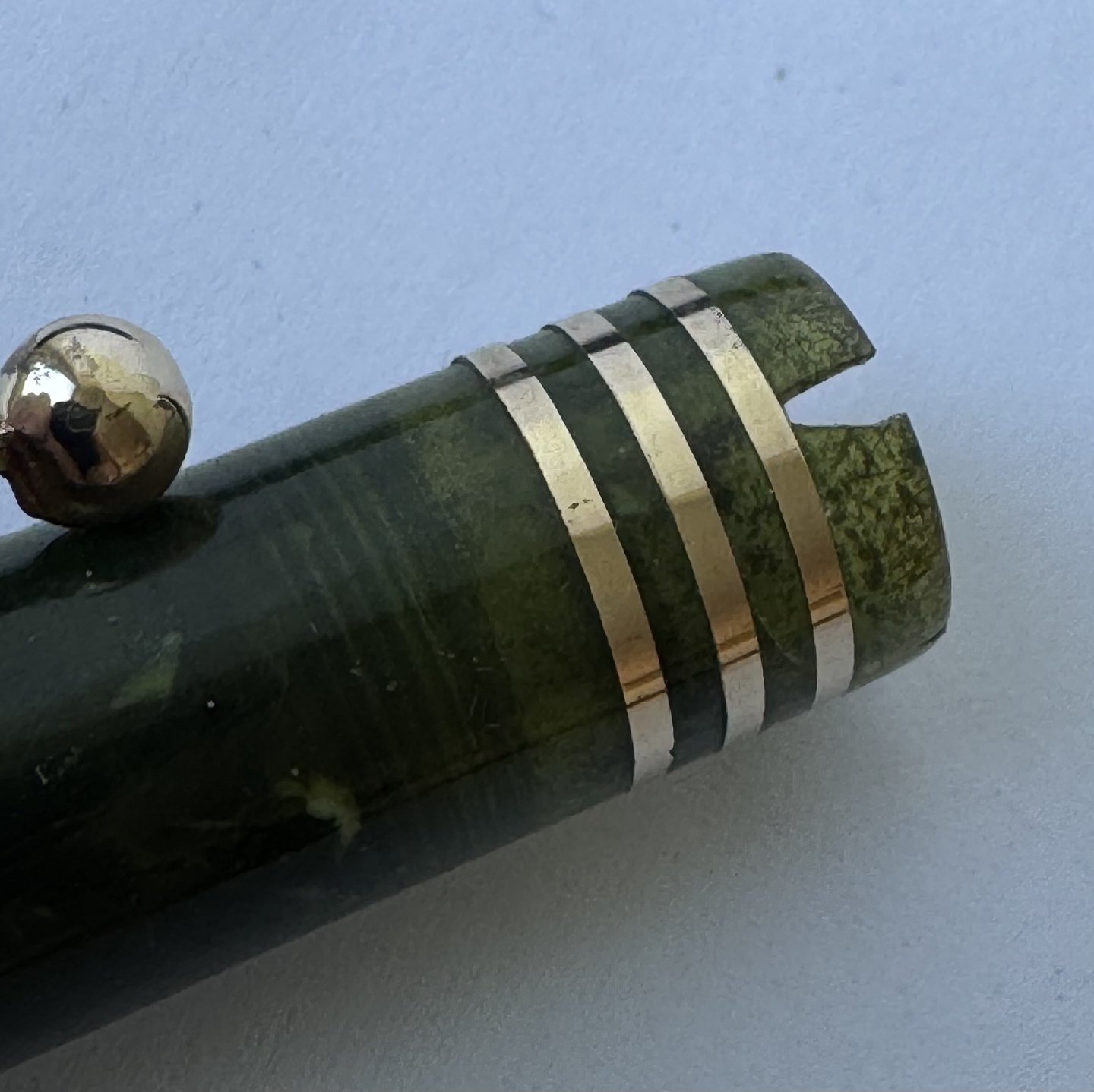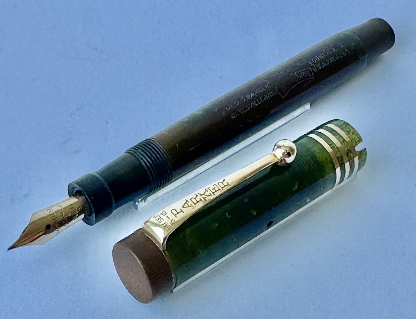 Kort grøn marmoreret Lady Parker Duofold Lucky Curve fyldepen fra omkring 1930. Har et stort skår på hættens åbning, kant. Ellers ingen skader eller reparationer. Push button blæk-påfylder. Der skal indsættes en ny gummisæk før end fyldepennen igen kan optage blæk og skrive.