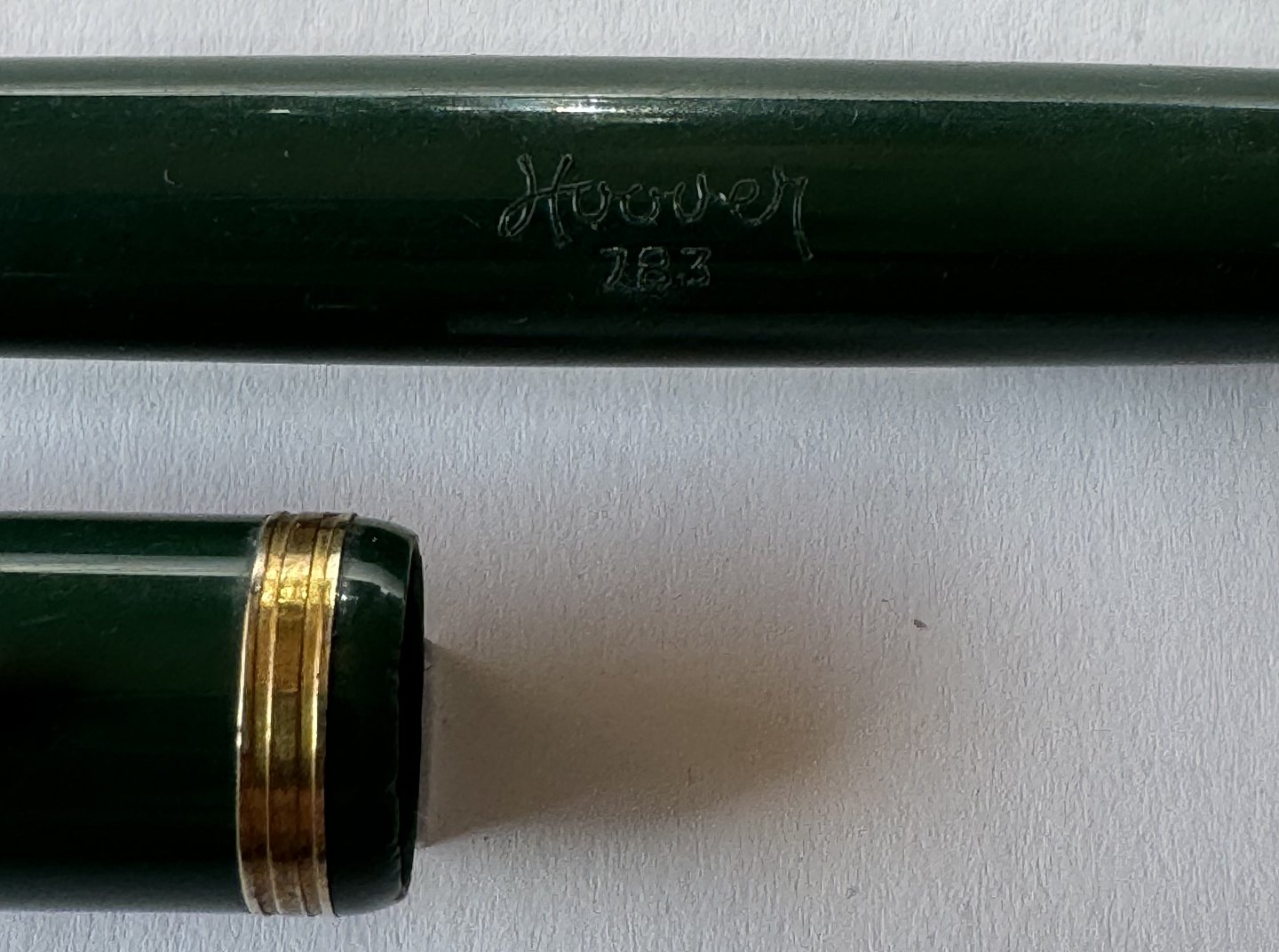 En vintage fyldepen klar til at blive brugt: Grøn Hoover nr. 783 fyldepen med piston filler blæk-påfyldningssystem. Alle dele originale. Nærmest ubrugt. Længde 12,5 cm.