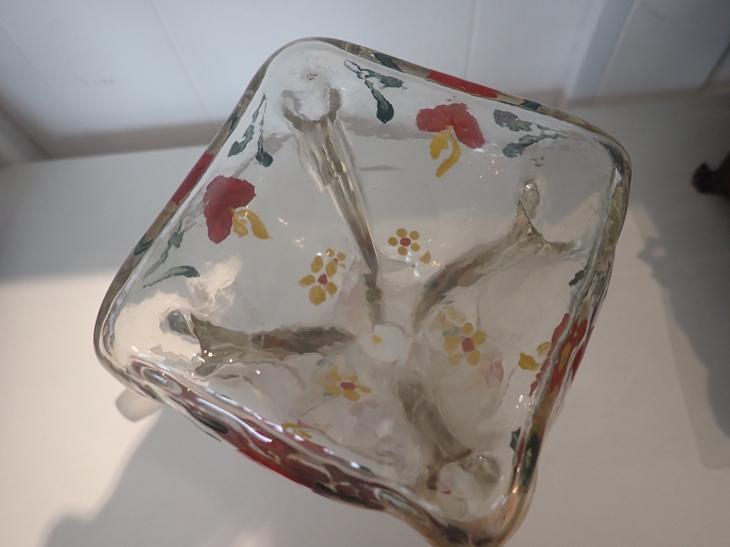 Emaljebemalet Klukflaske (hjerter og blomster) fra Holmegaard designet af Jacob A. Bang i 1937 - 1957 - i meget fin stand - sælges alene for 4oo kr. Højde: 29 cm. I fin stand