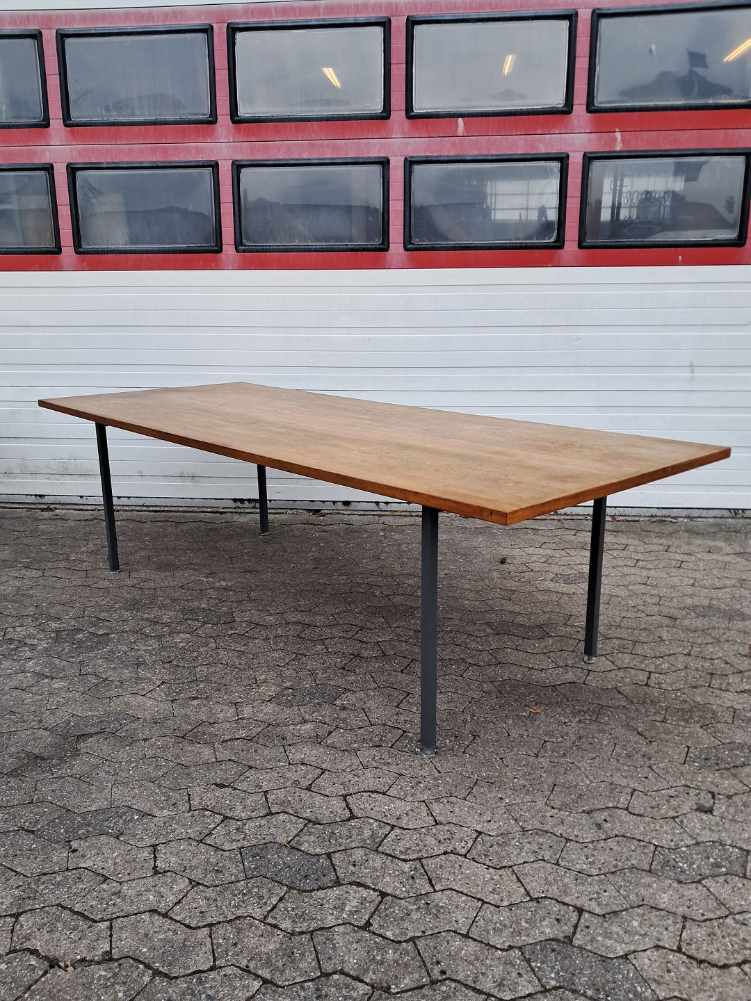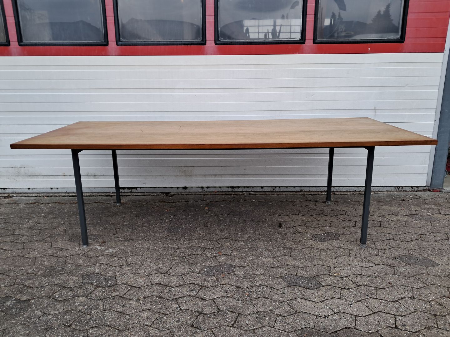 Konferencebord i fineret teaktræ med metal understel, fra 1970erne.