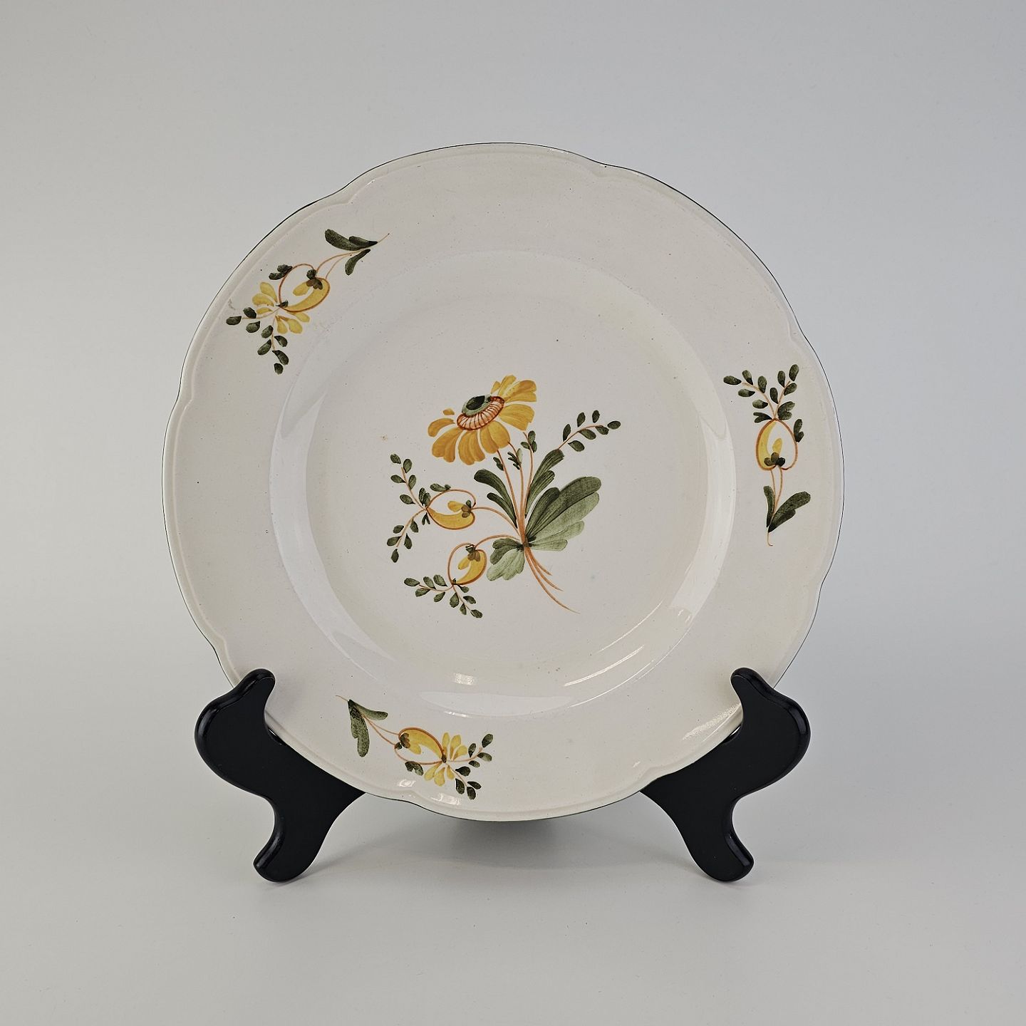 Hvidt fajancestel i stelform Feston/Alma med motiv af gule blomster og grønne blade.