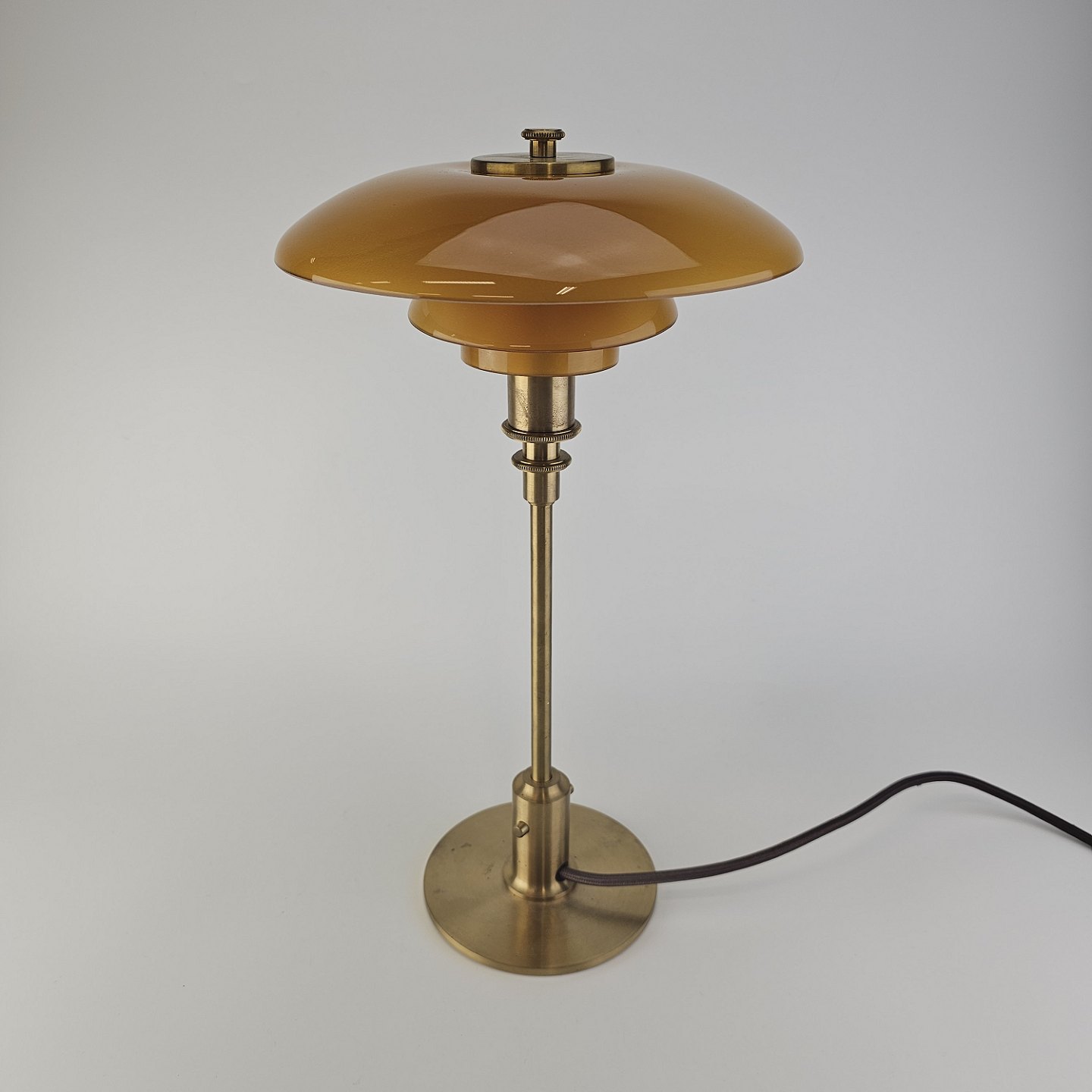 Bordlampe PH 3/2 med skærm af mundblæst ravfarvet etlagsglas og fod af strøgslebet messing