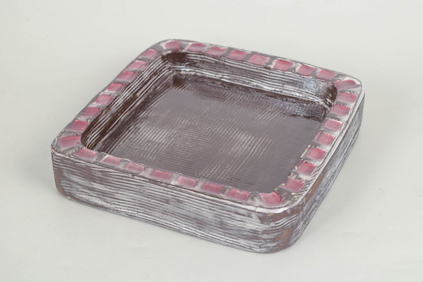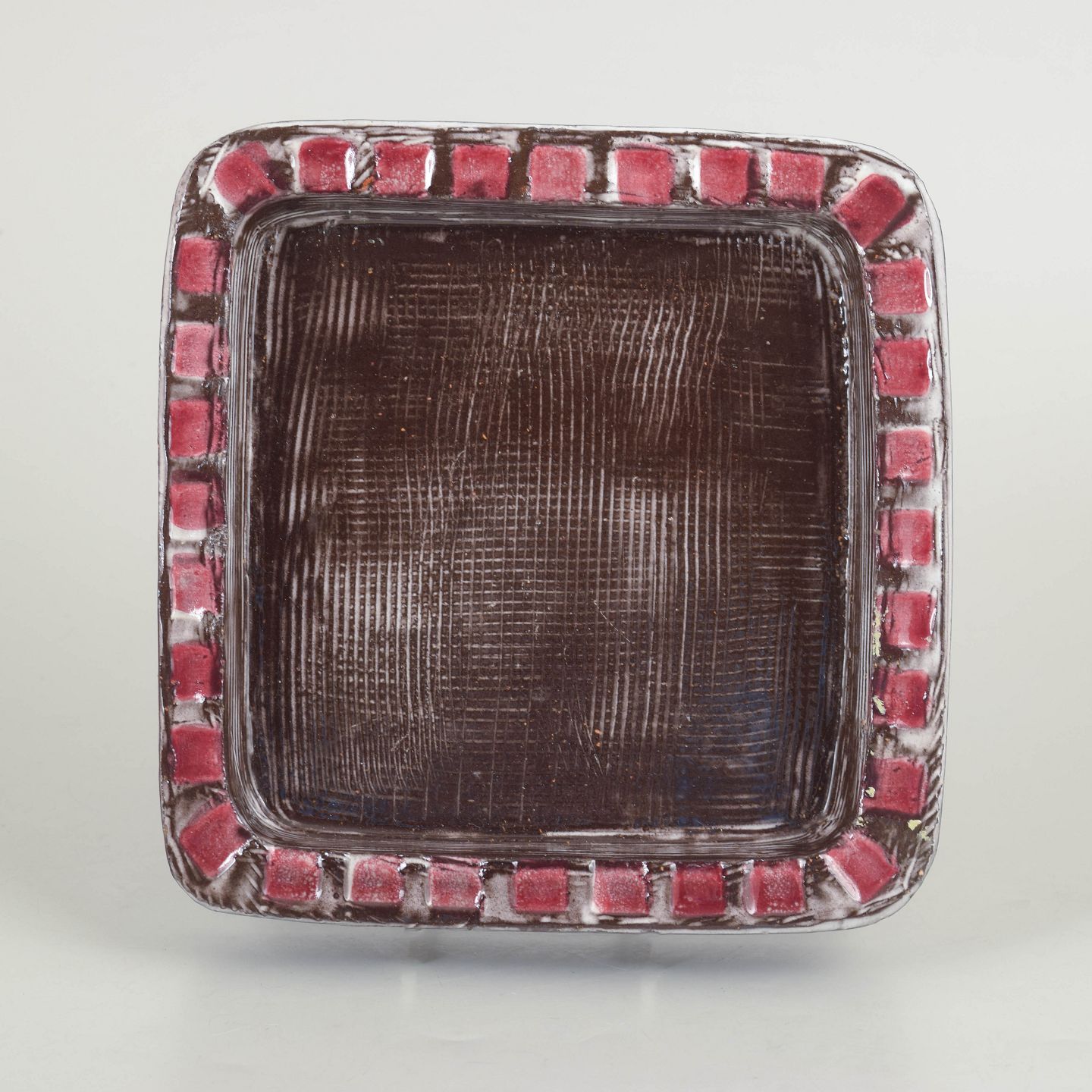 Kvadratisk fad i stentøj med mørk brun glasur i midten og dekorativ rand med relief og røde felter i gentagende mønster. Let struktureret overflade. Model 4156.