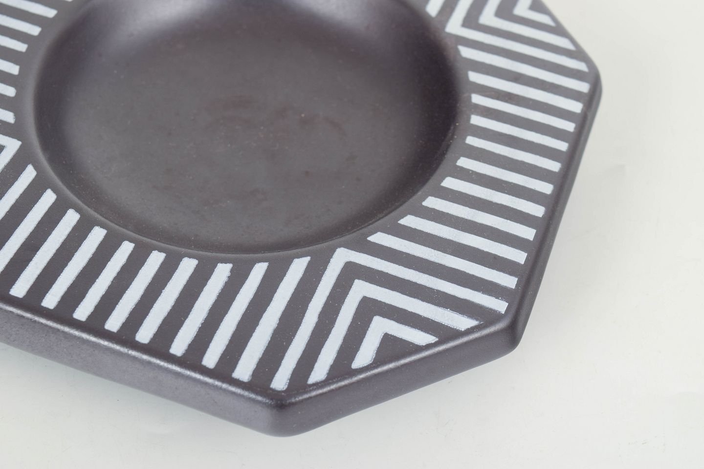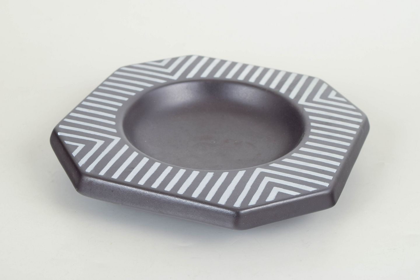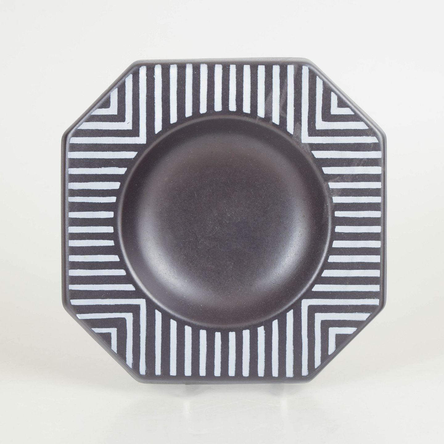 Dekorativt ottekantet fad i stentøj med grafisk dekoration i sort og hvid med stribede felter og geometrisk mønster. Model 4254.