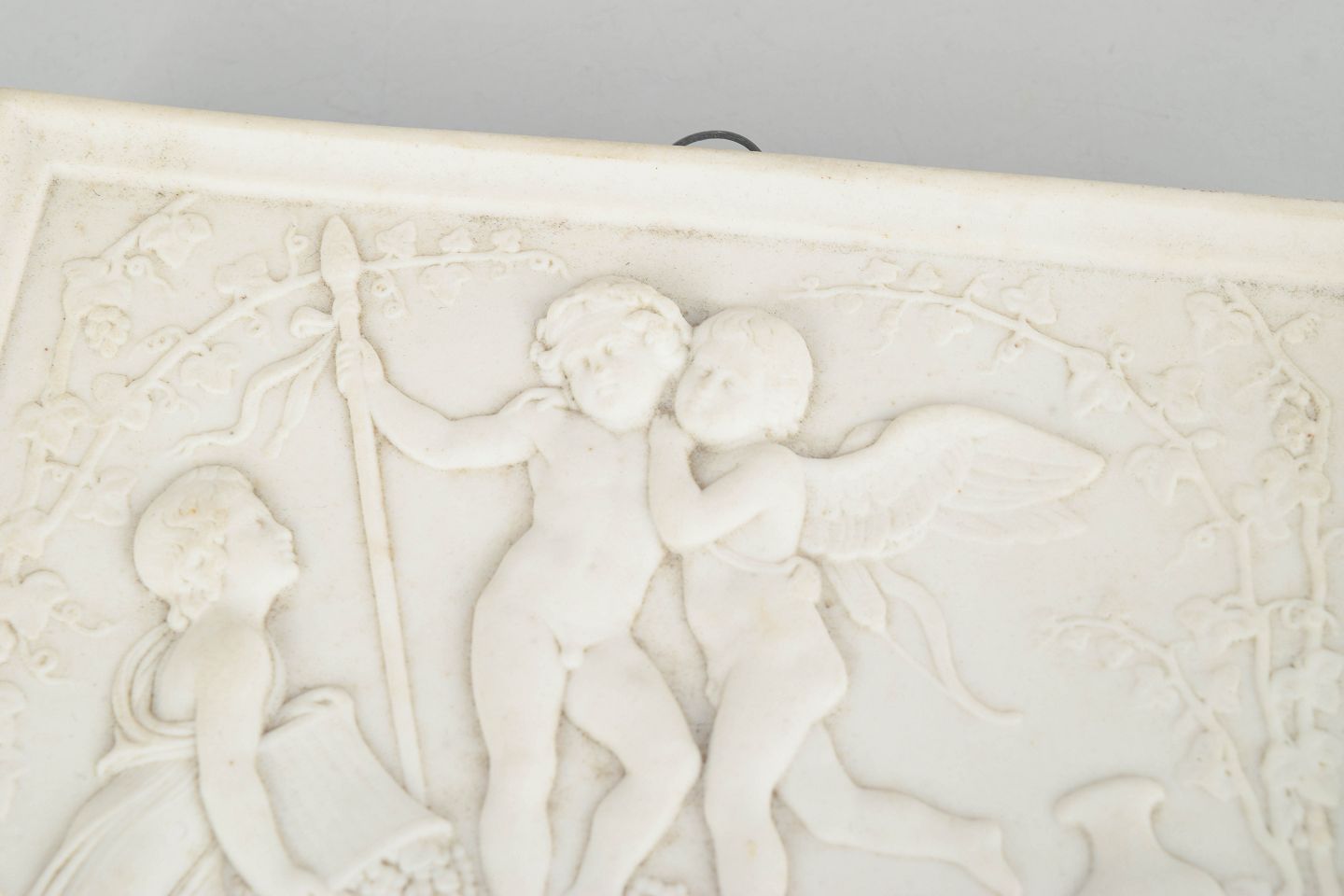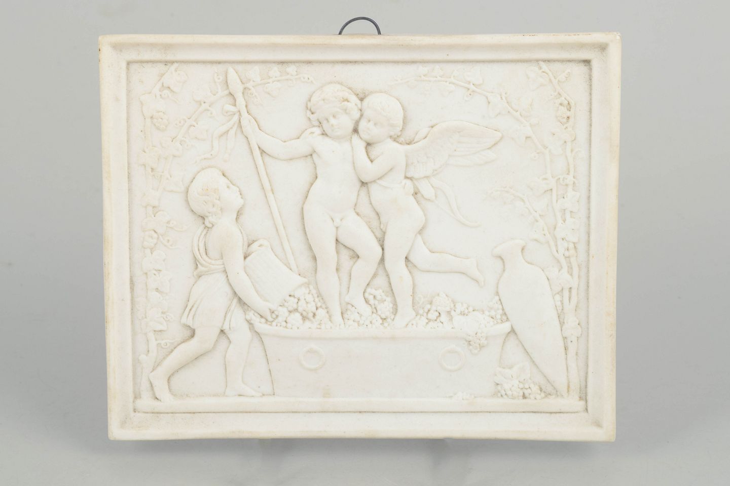 Rektangulært vægrelief i hvidt bisquitporcelæn med klassicistisk motiv af putti i figurkomposition efter Bertel Thorvaldsen, udført med fine detaljer og blød modellering i nyklassicistisk stil.