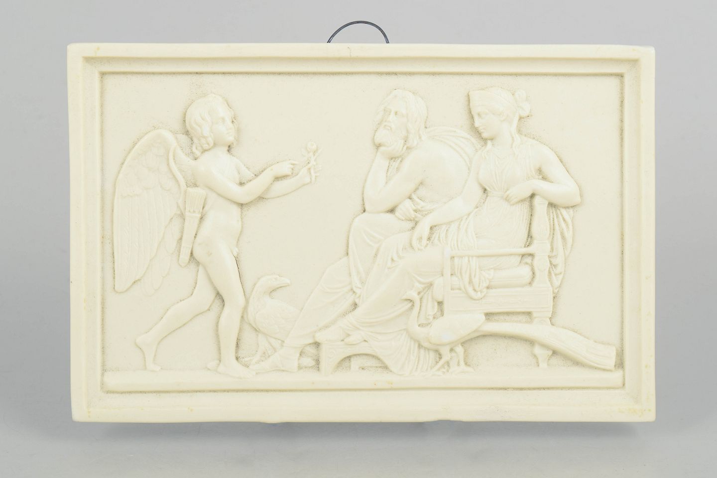 Rektangulært vægrelief i hvidt bisquitporcelæn med klassicistisk figurmotiv efter Bertel Thorvaldsen, udført med fine detaljer og blød modellering i nyklassicistisk stil.
