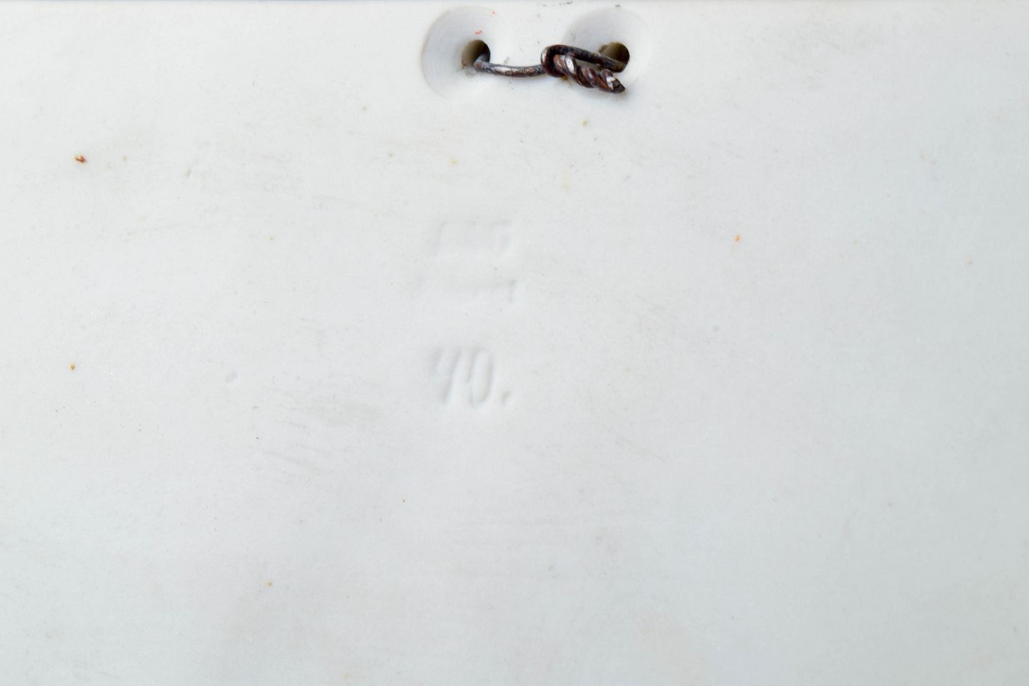 Rektangulært vægrelief i hvidt bisquitporcelæn med klassicistisk motiv af putti og figurkomposition efter Bertel Thorvaldsen, udført med fine detaljer og blød modellering i nyklassicistisk stil.