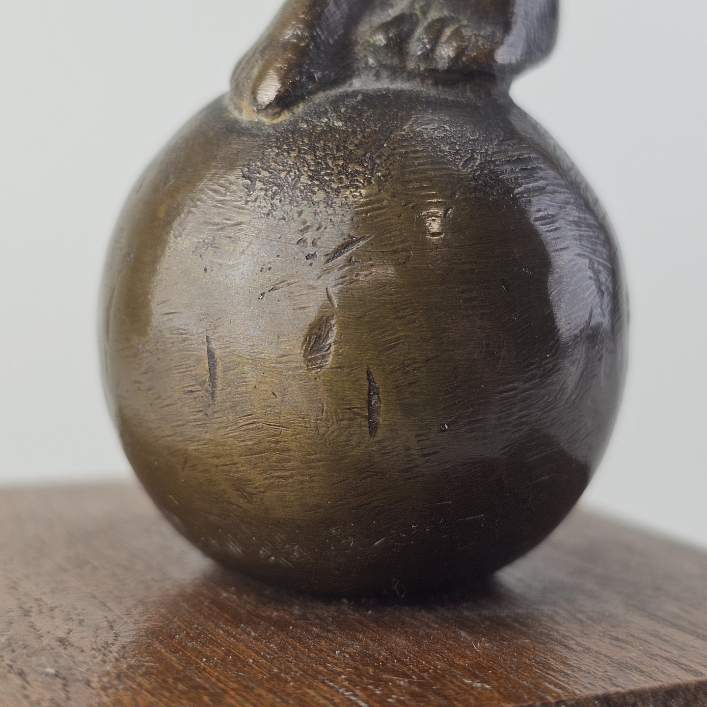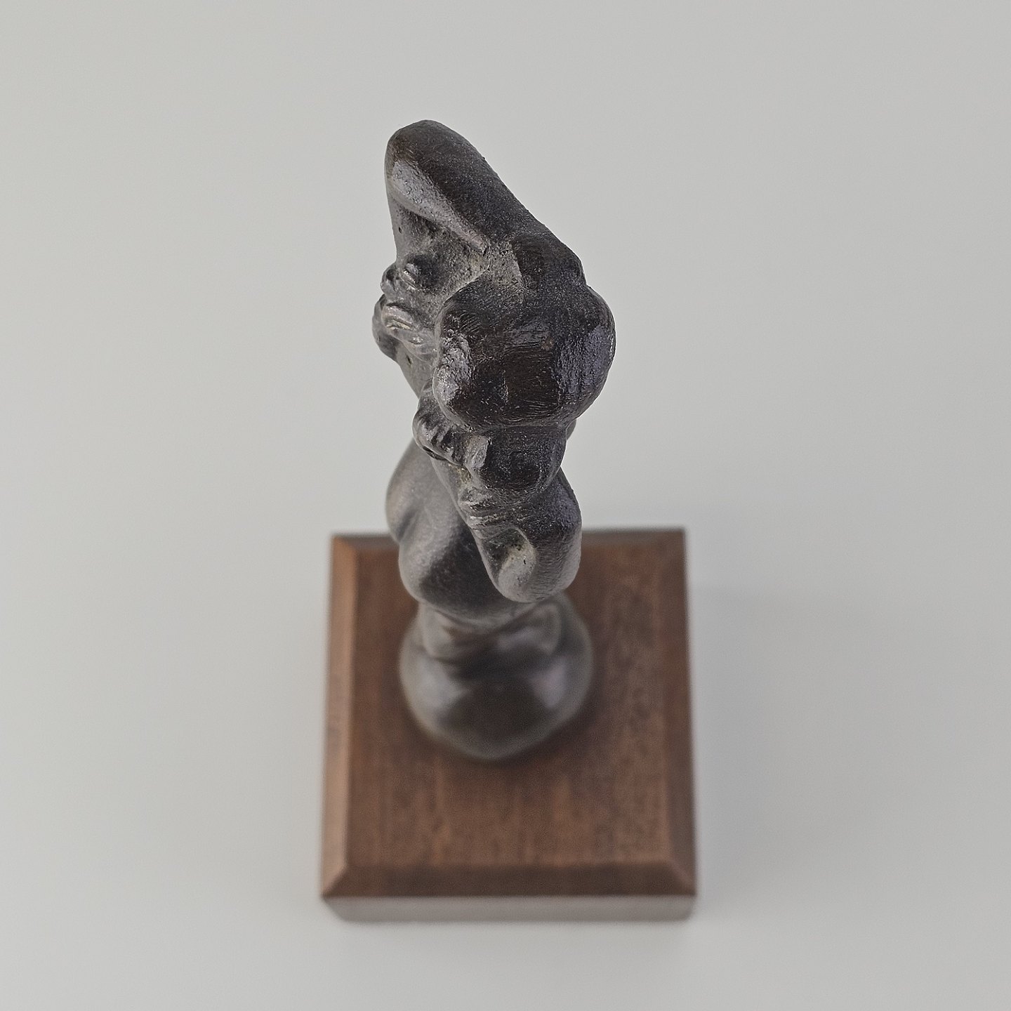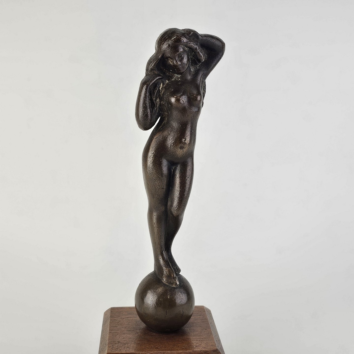 Figur med motiv af en kvinde på træsokkel, bruneret messing