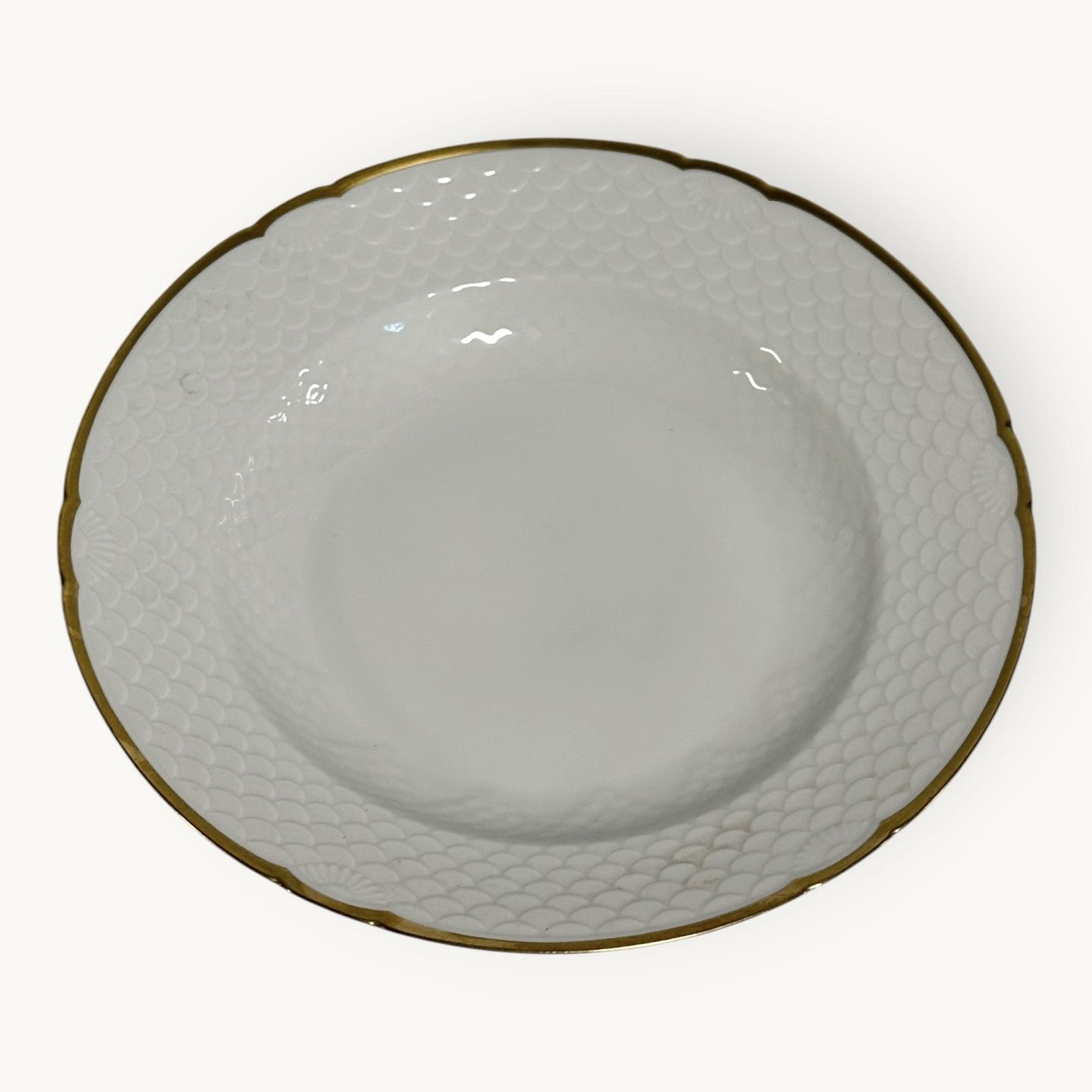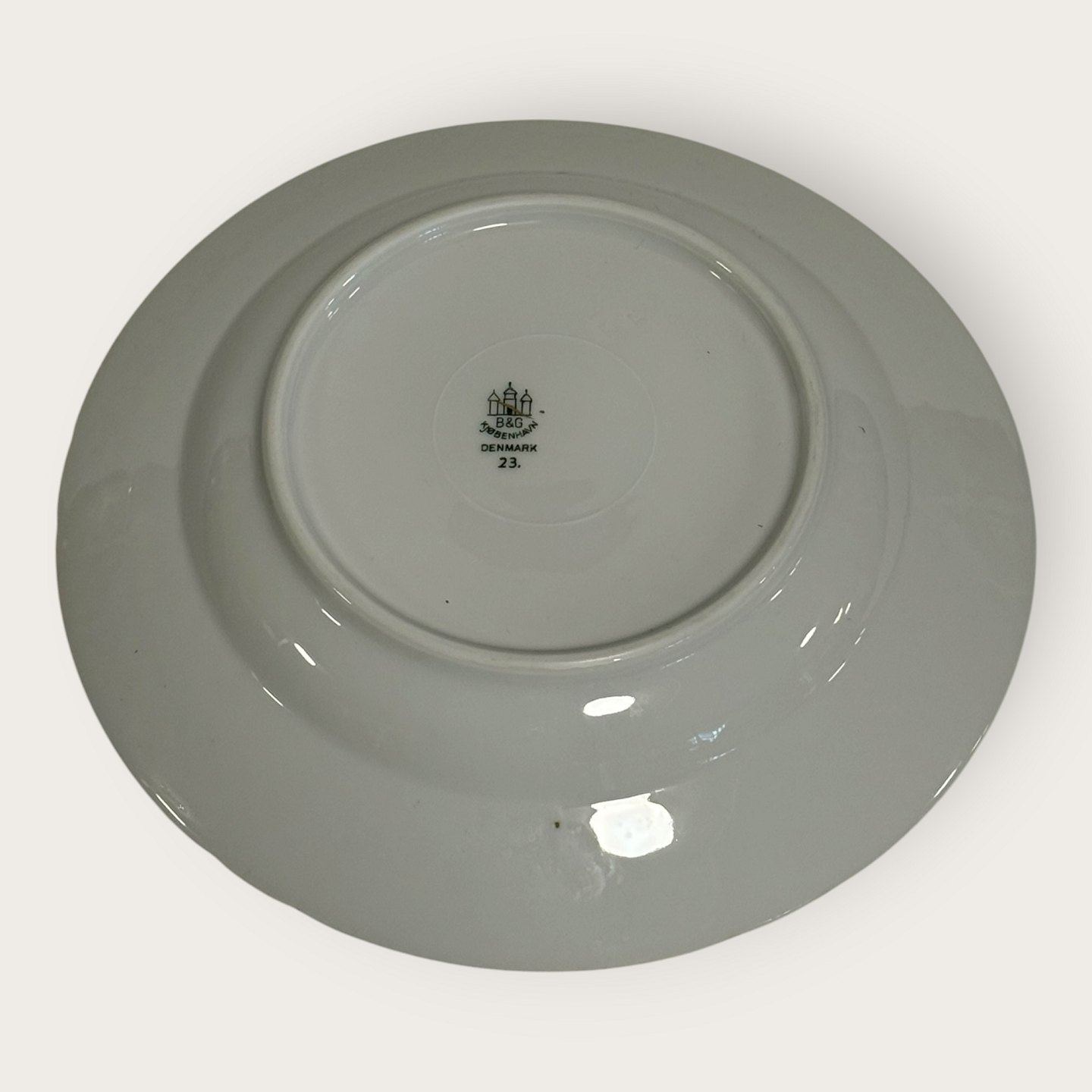 Bing & Grøndahl, Aakjær, Hvid porcelæn med en guldkant, dyb tallerken # 23, 21,5cm i diameter, 1.sortering *Pæn stand*