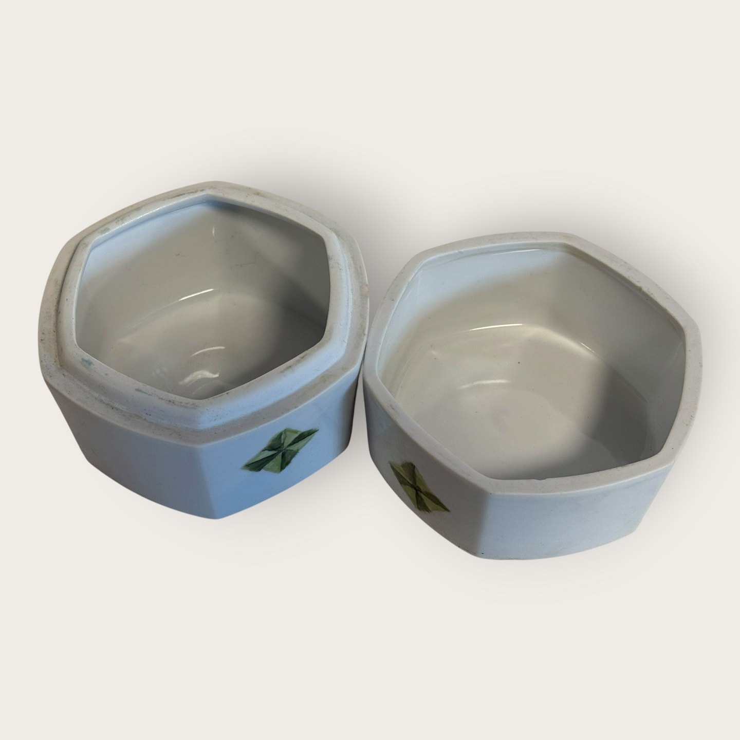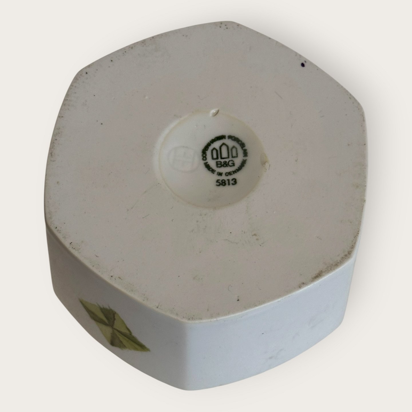 Bing & Grøndahl, Lågkrukke med grøn dekoration, # 5813, ca. 11x11cm, *Nogle meget små skrammer på kanten (se foto) ellers fin stand*