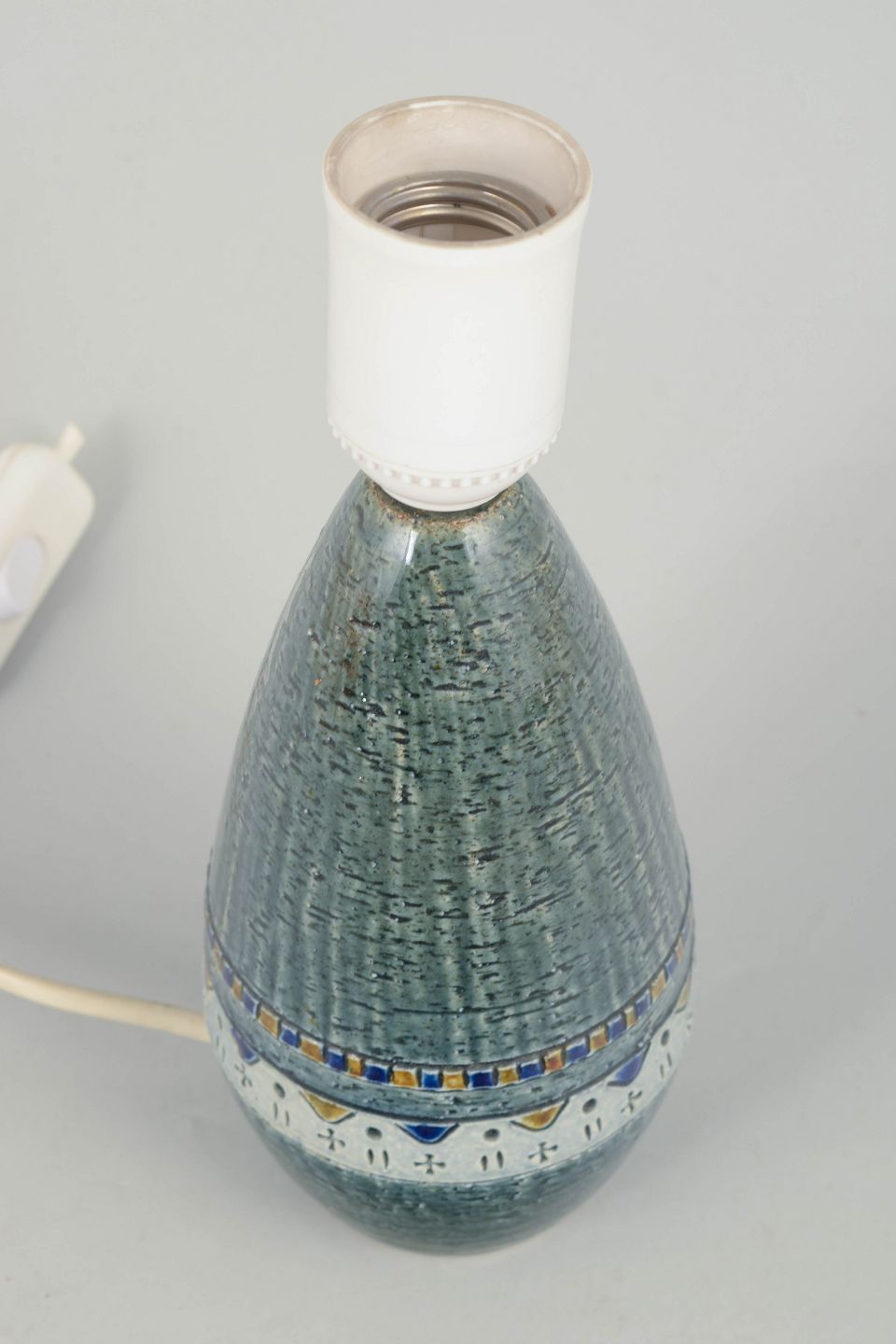 Dekorativ bordlampe i stentøj med karakteristisk reliefmønster og grøn glasur, monteret med lys fatning. Kort ledning uden stik.