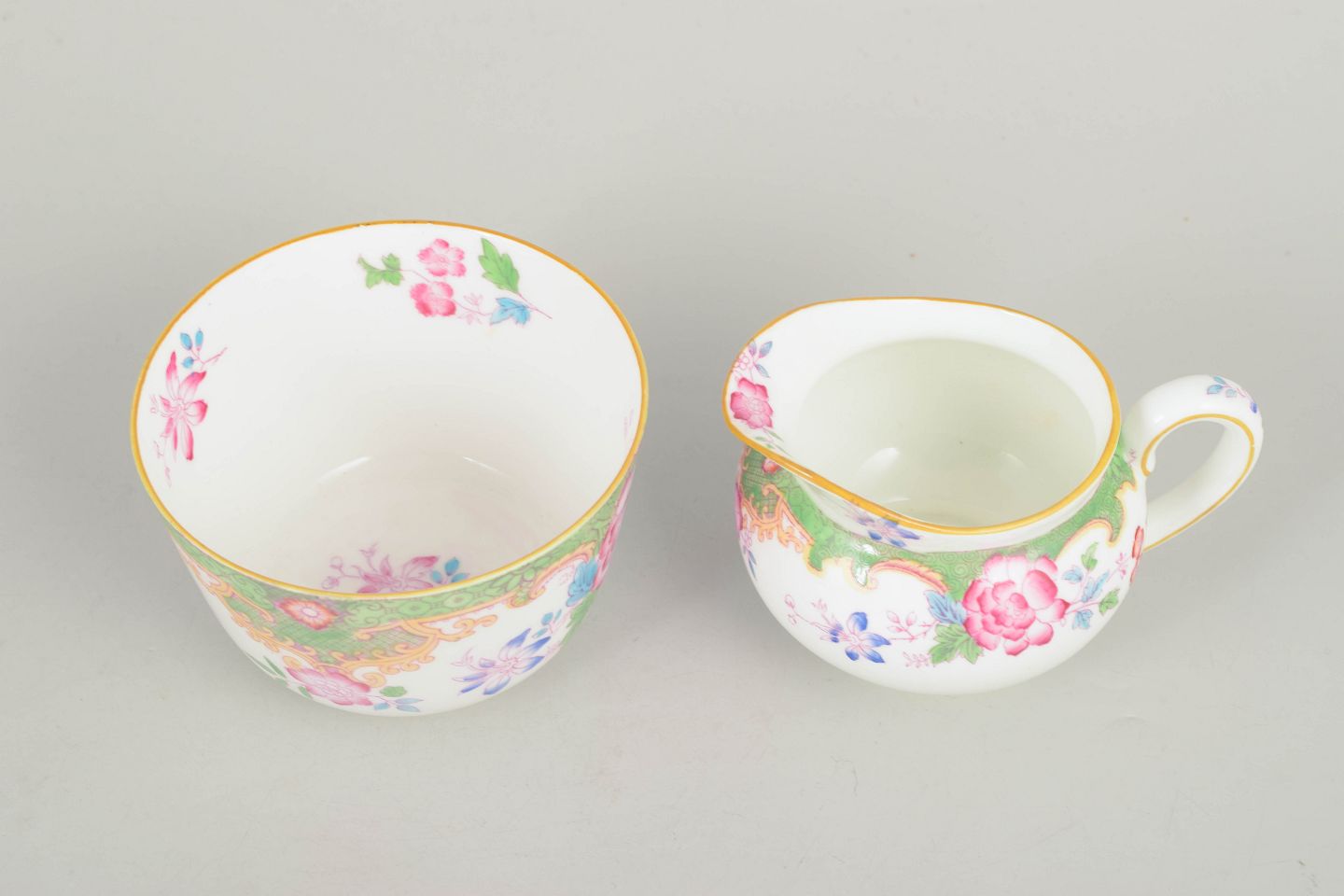 Dekorativt sæt i porcelæn bestående af flødekande og sukkerskål med farverig blomsterdekoration i Temple mønster og karakteristisk grøn bort.