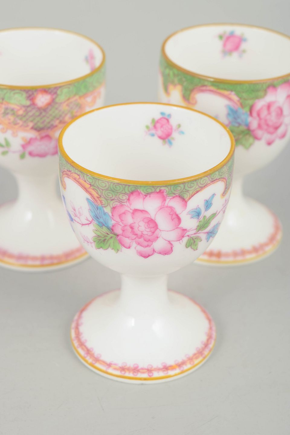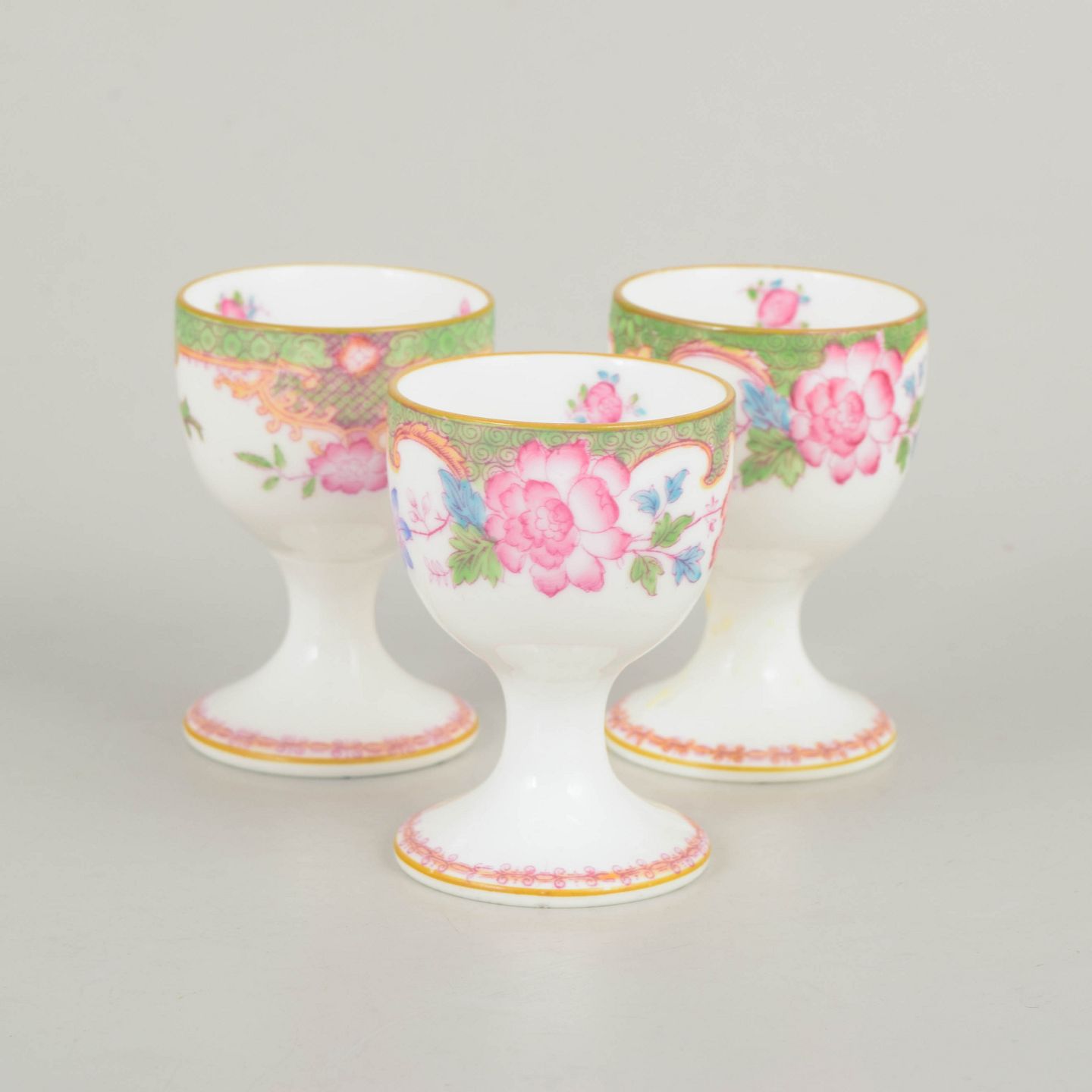 Dekorative æggebægre i porcelæn med farverig blomsterdekoration i Temple mønster og karakteristisk grøn bort.