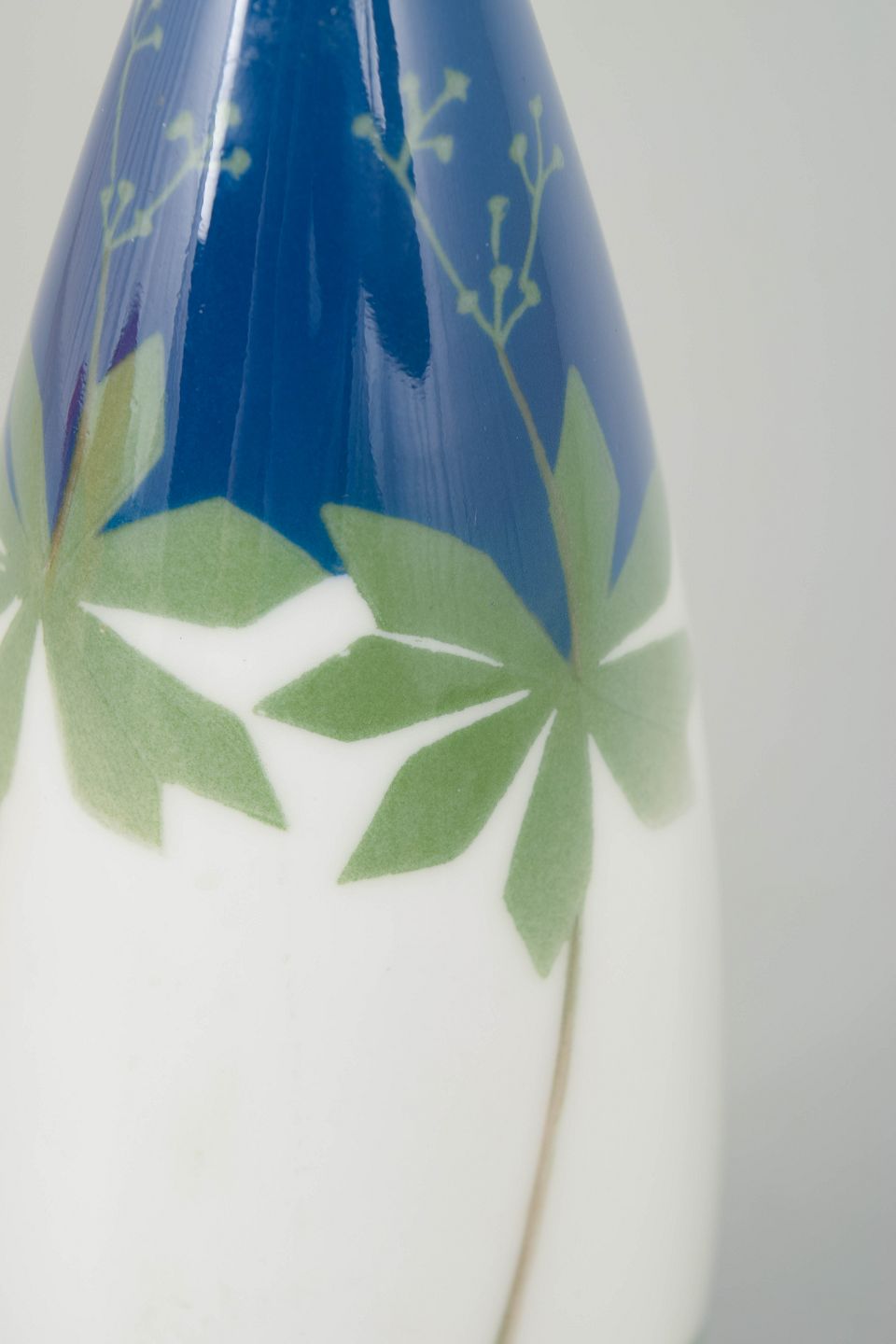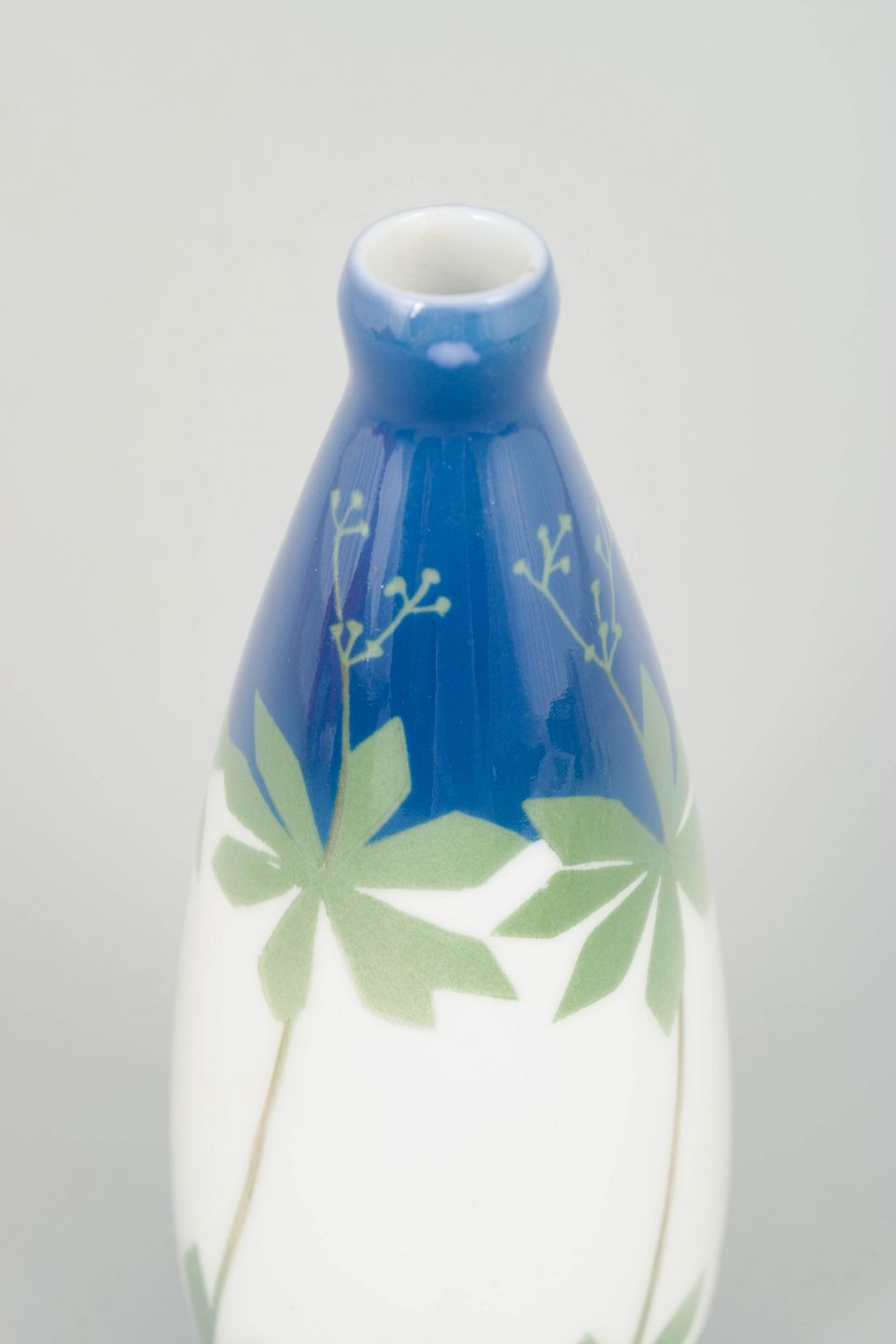 Elegant vase i porcelæn med organisk art nouveau dekoration i blå og grønne nuancer med stiliserede bladmotiver.