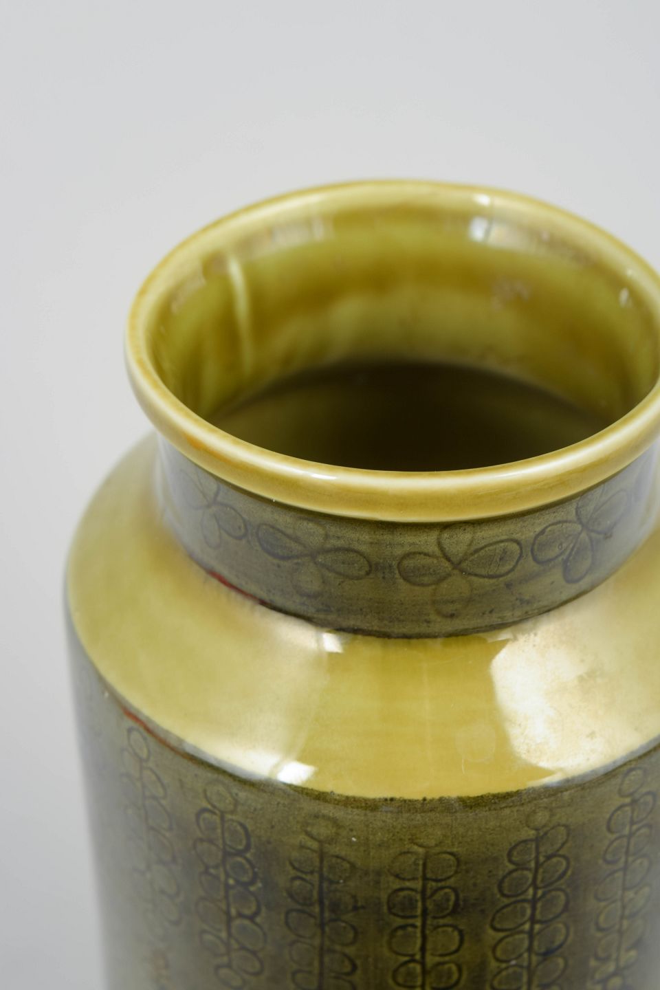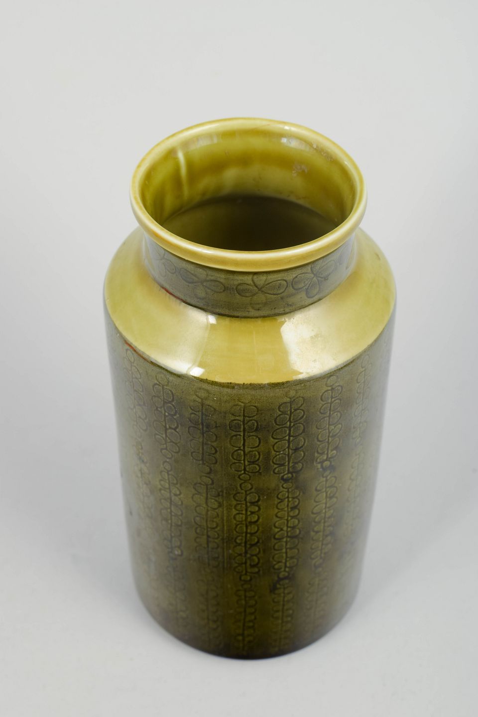 Cylindrisk stentøjsvase med slank form og let udadbøjet hals. Dekoreret med grafisk mønster i dæmpede toner under blank glasur med gul nuance ved randen, karakteristisk for Rörstrands produktion i midten af det 20. århundrede.