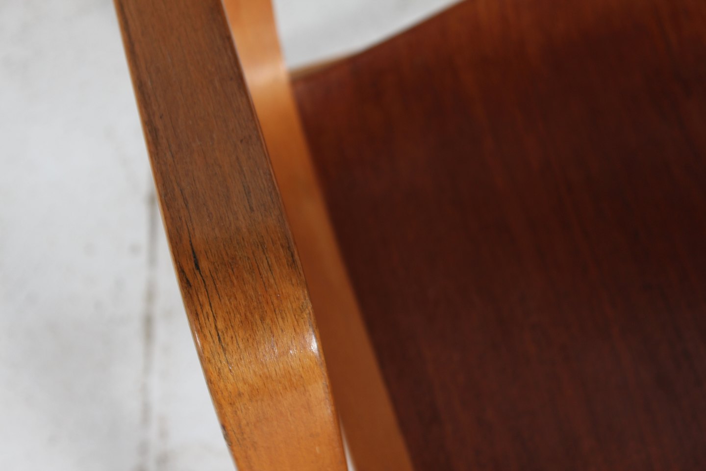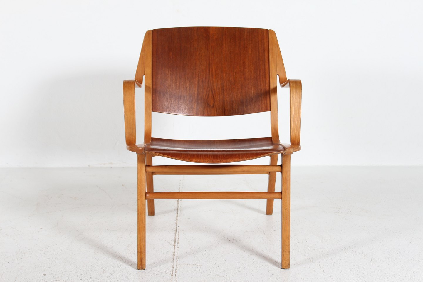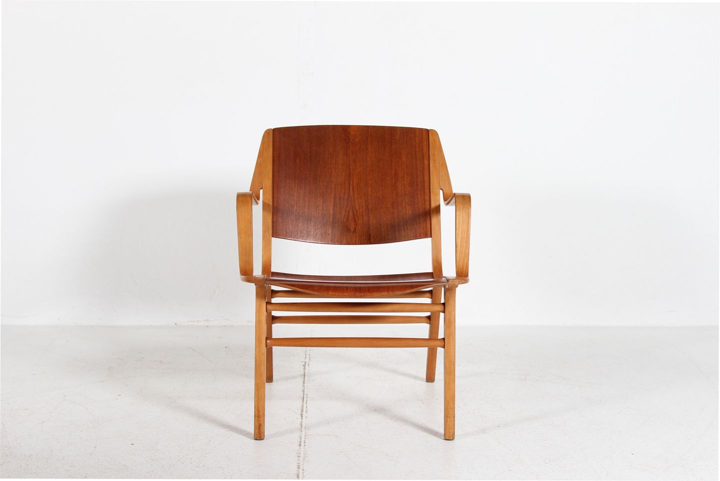 Armstol fremstillet af formspændt bøg og teak