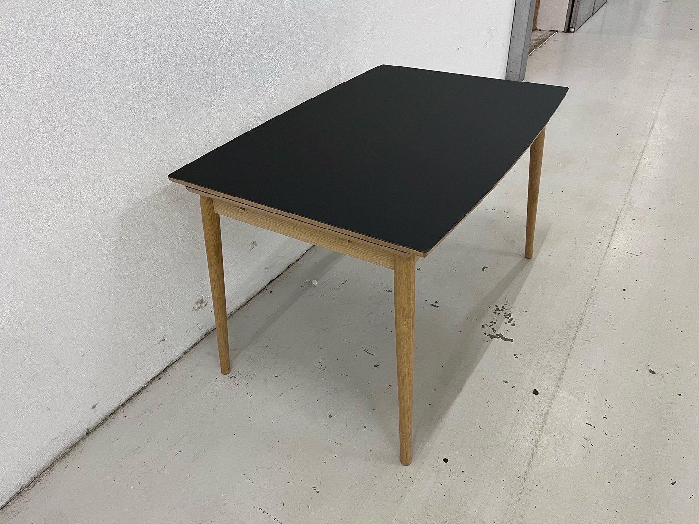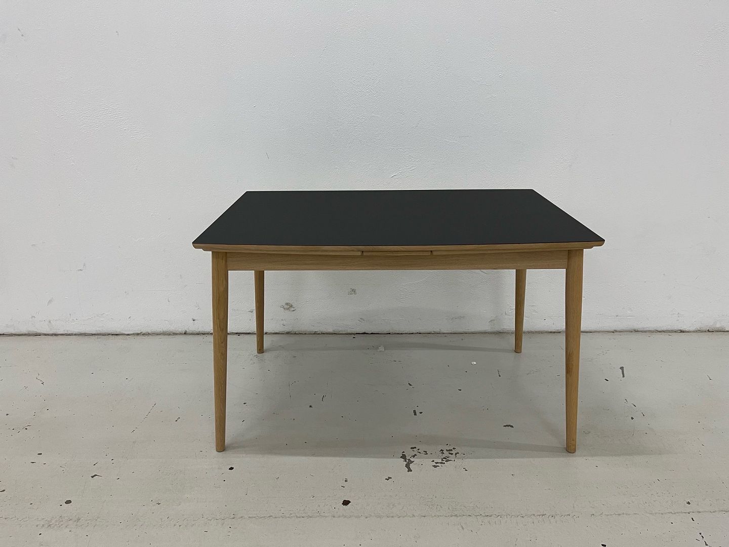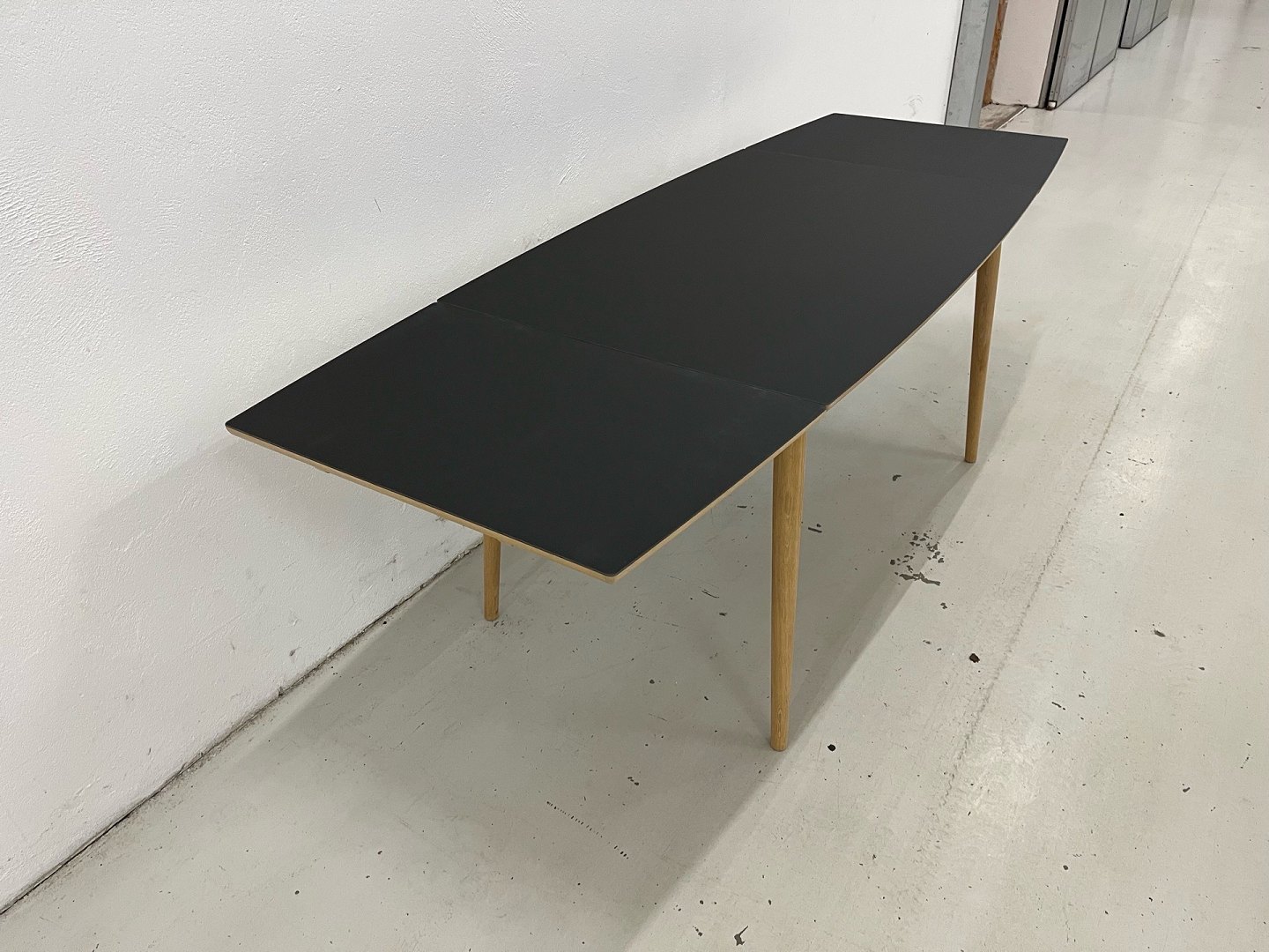 Curve spisebord fra Pbj Design med 2 x hollandsk udtræk. Bordplade i sort linoleum samt stel og ben i sæbebehandlet egetræ.
