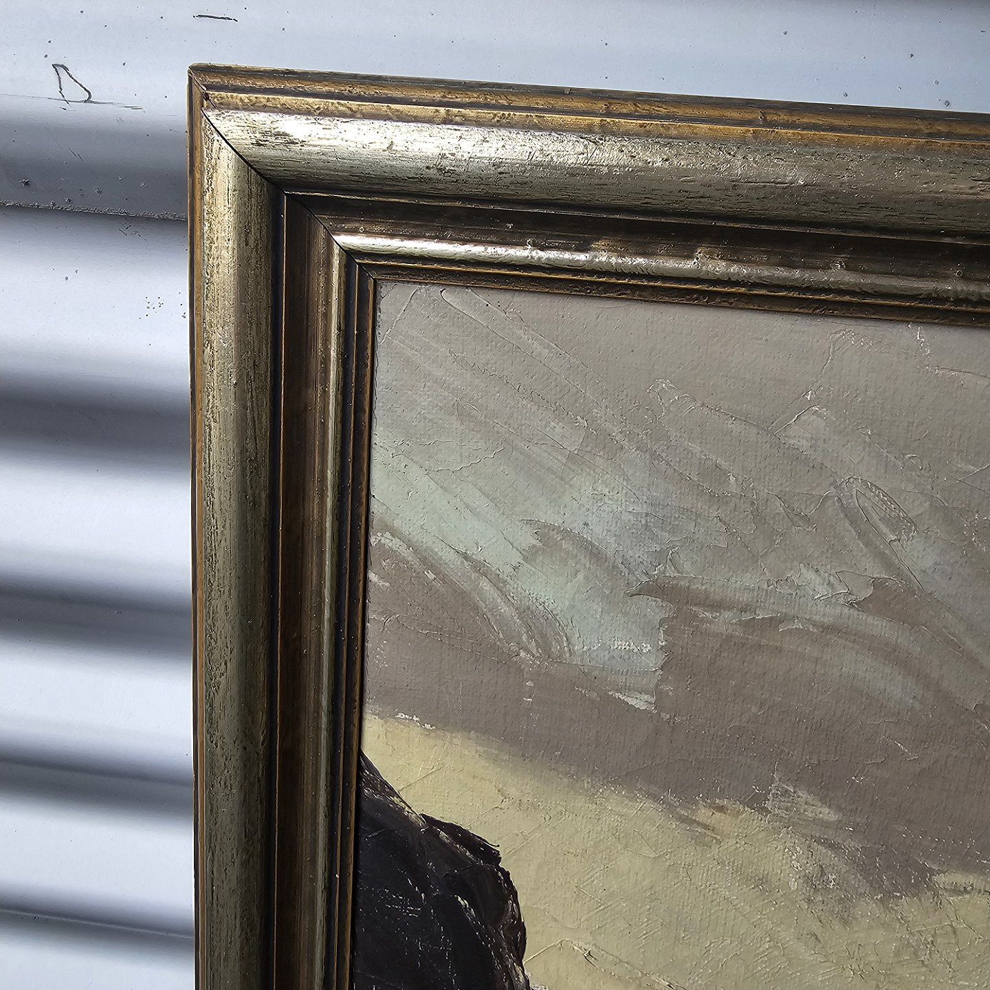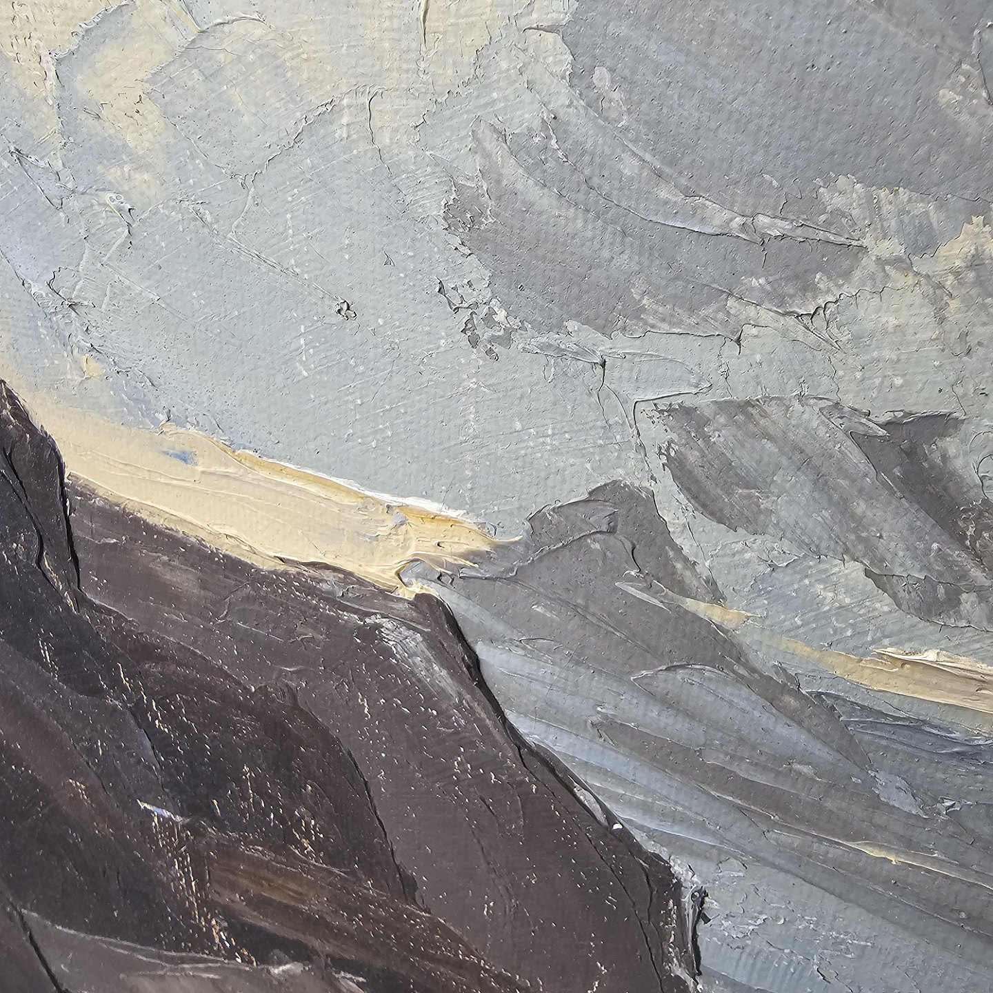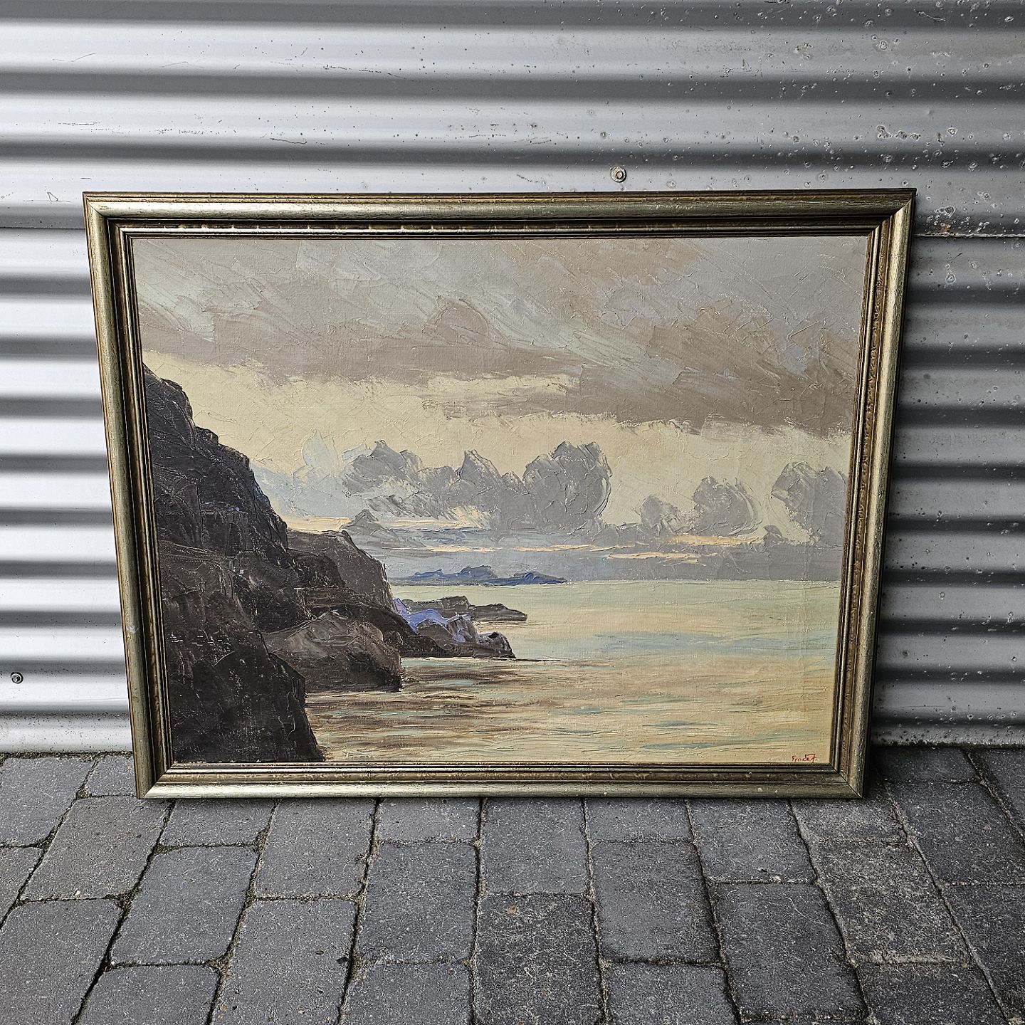 Oliemaleri på lærred monteret i træramme med motiv af hav og klipper. Måske motiv fra Grønland