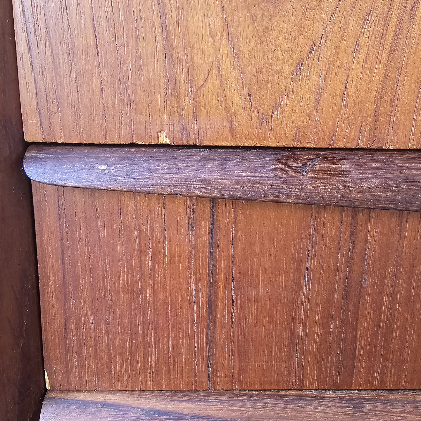 Skrivebord i teaktræ med skuffer i begge sider, øverste skuffer med nøgle