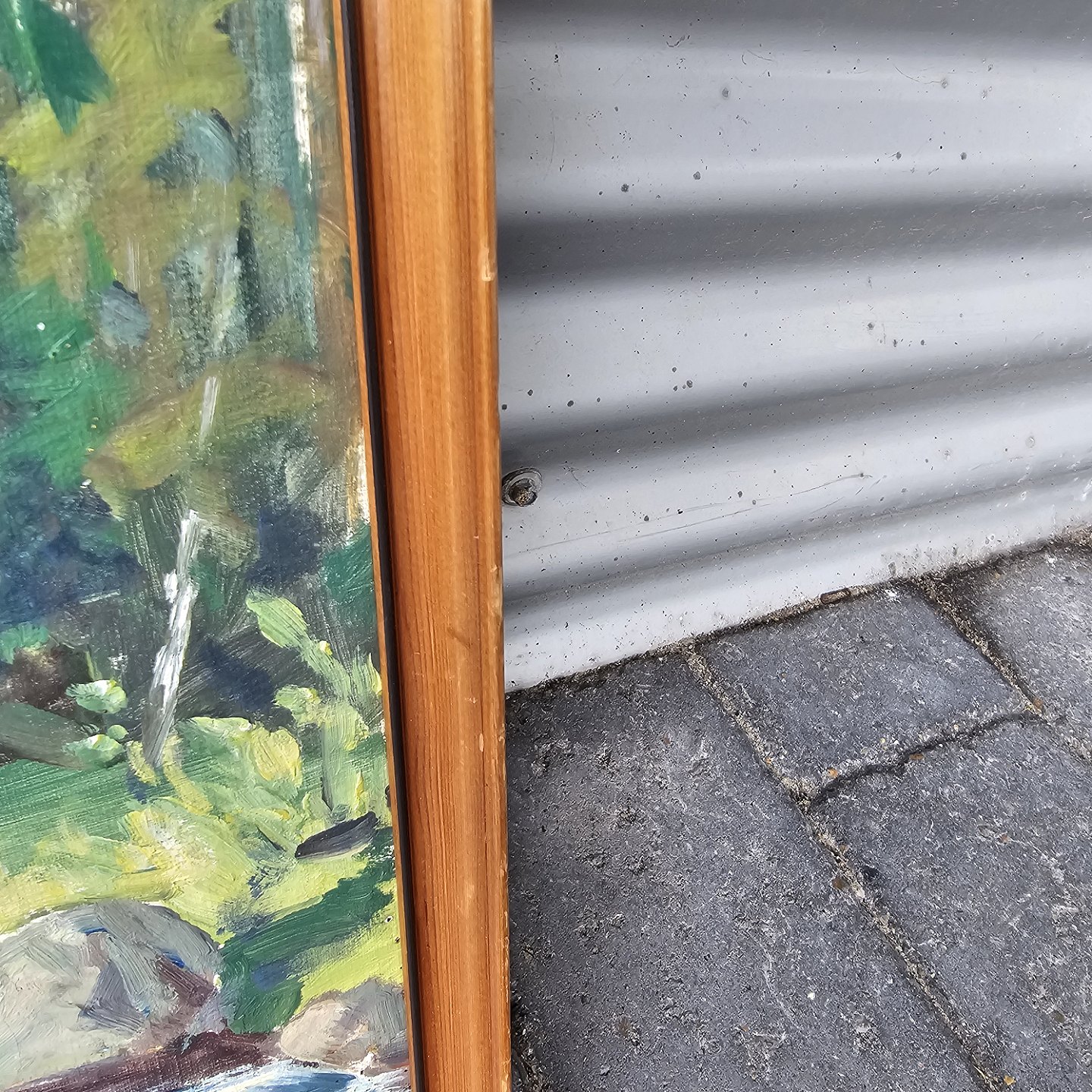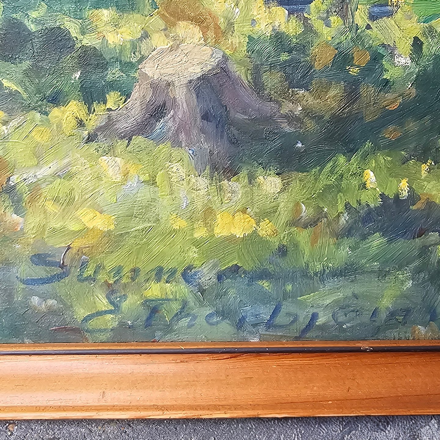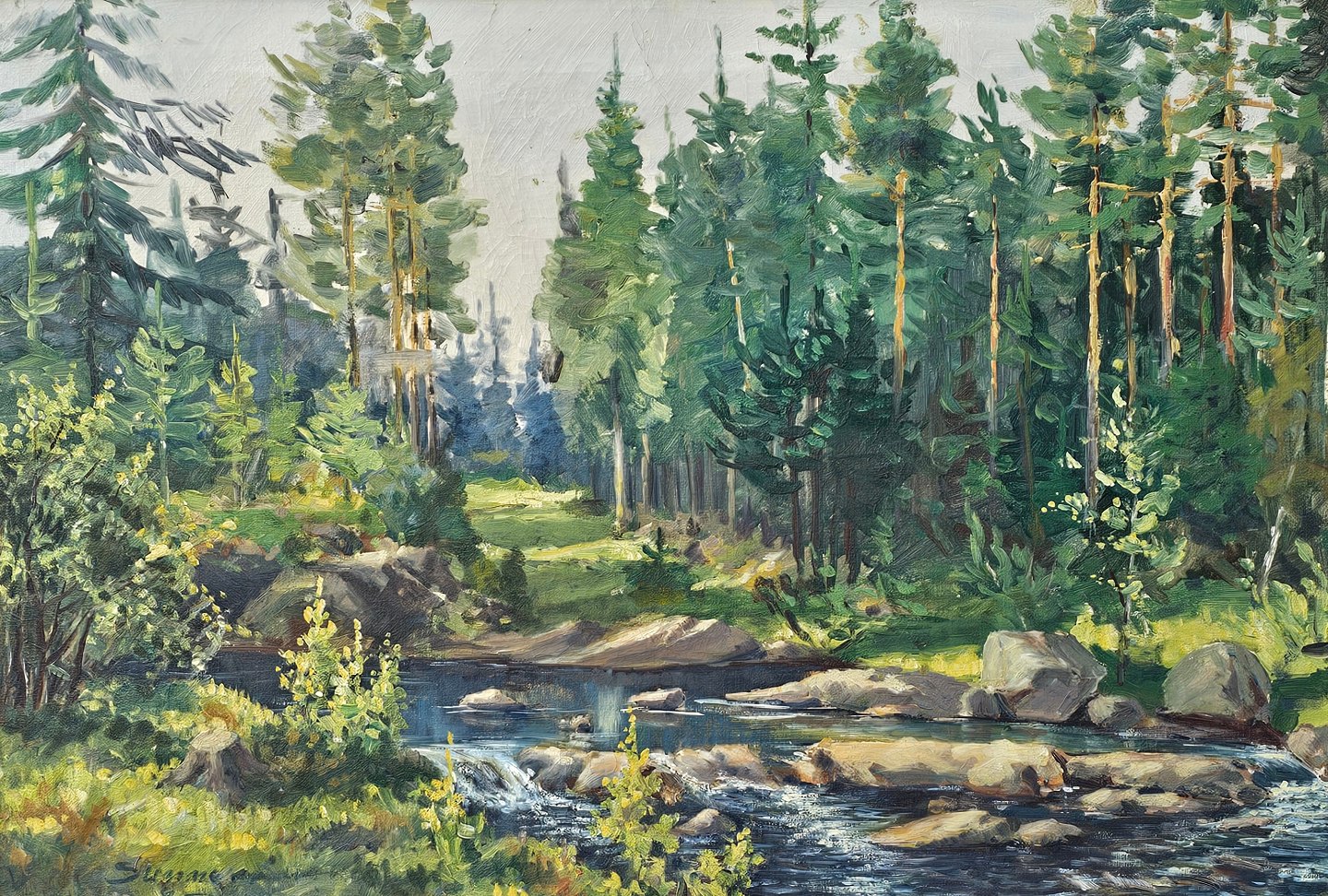 Oliemaleri på lærred med titlen Sommer. Monteret i træramme med motiv af et vandløb i en skov