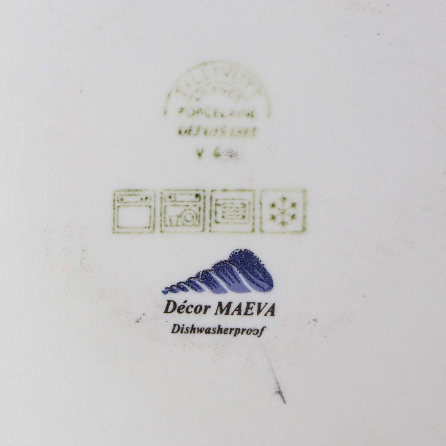 Service i glat hvid porcelæn med blåt bånd og dekoration af gule vifteformede strandskaller. Stellet kan gå i opvaskemaskinen.