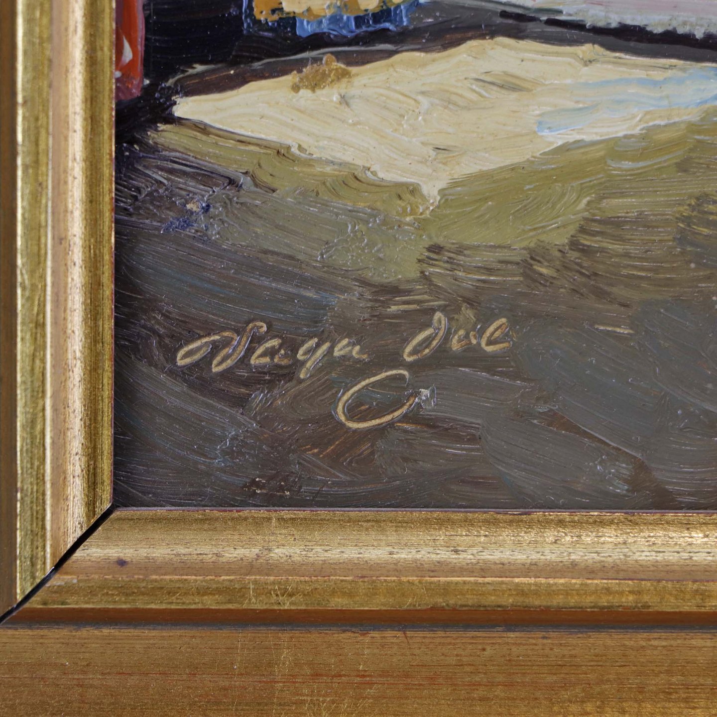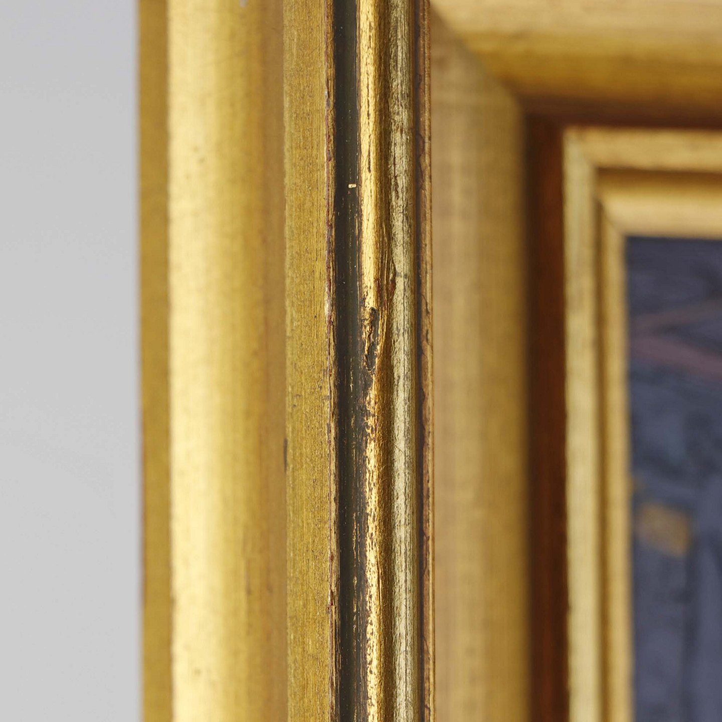 Maleri på plade i guldmalet træramme med med ældre interiør motiv fra dansk bondehus.