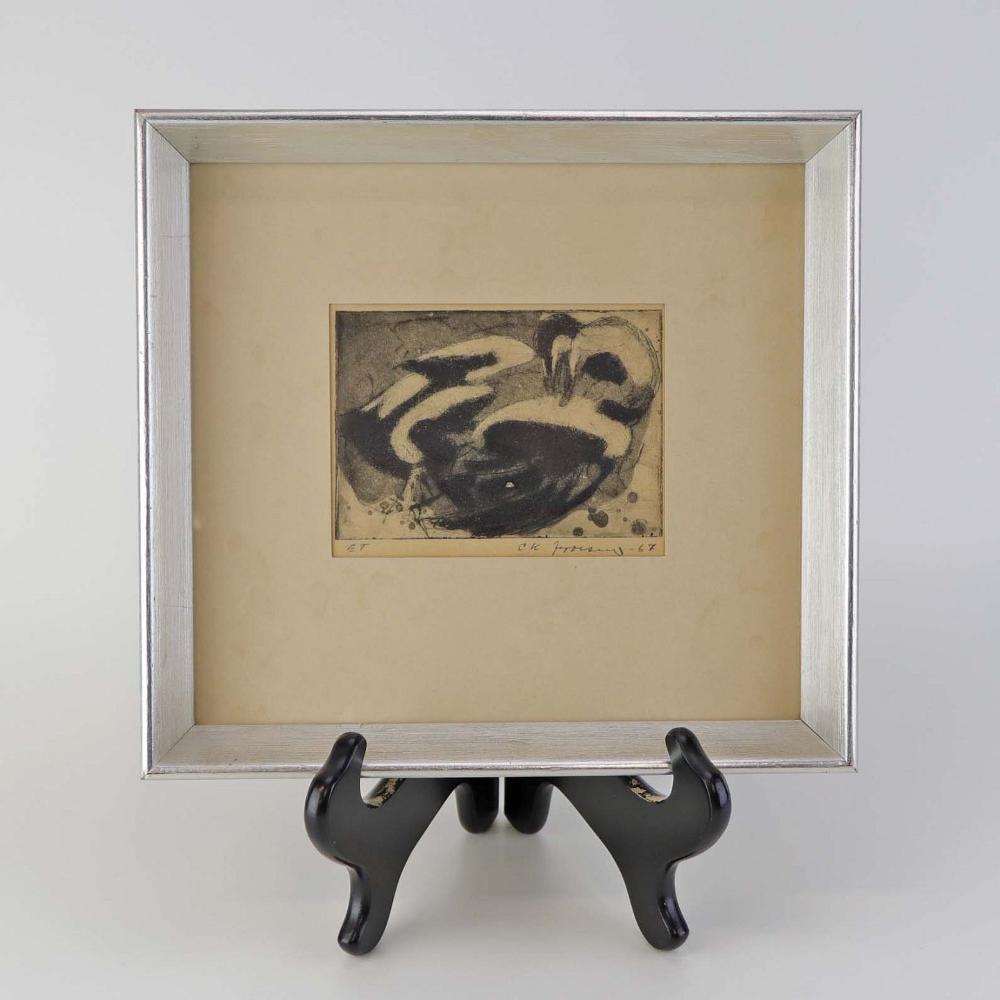 Litografi fra 1967 i passepartout ramme med sort hvidt naturmotiv af to fugle