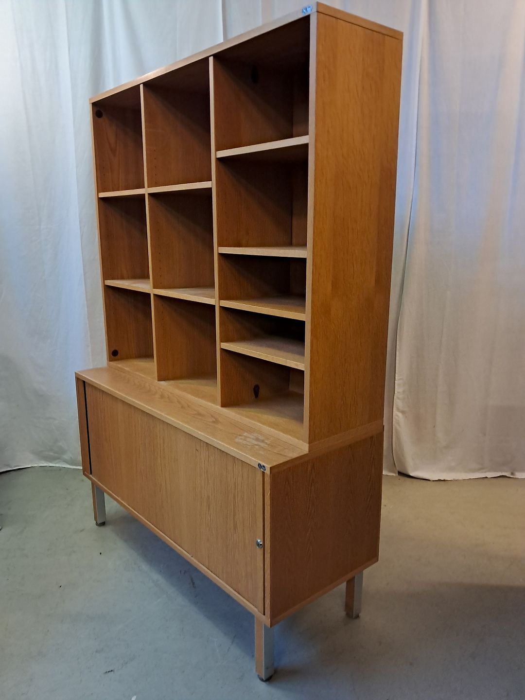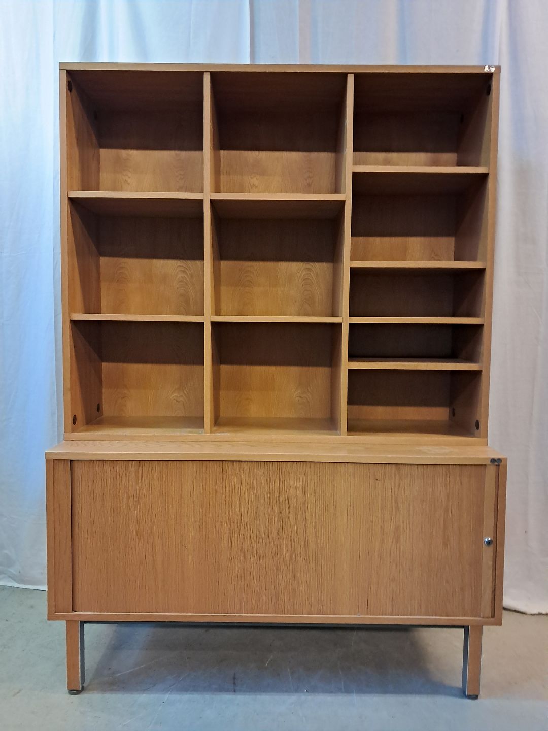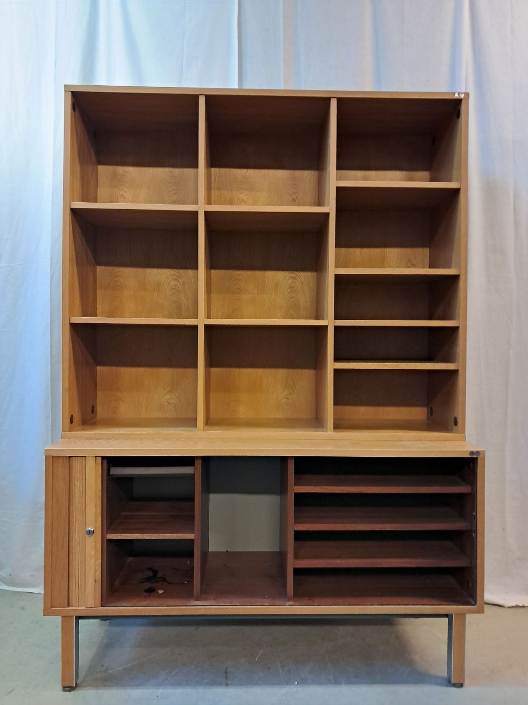 2 delt reolsektinon i fineret egetræ med jalousilåge, fra 1980erne.