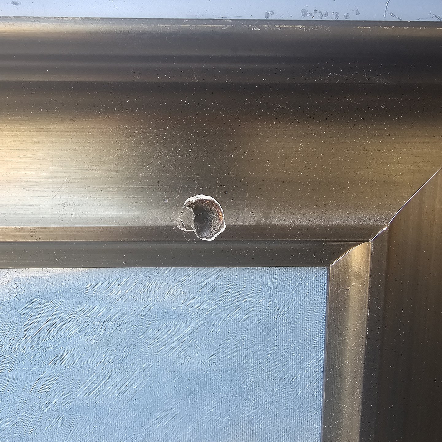 Oliemaleri på lærred monteret i bred træramme med landskabsmotiv