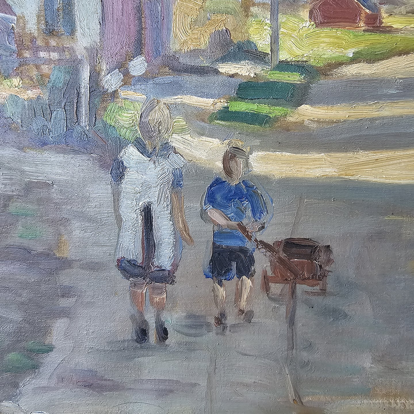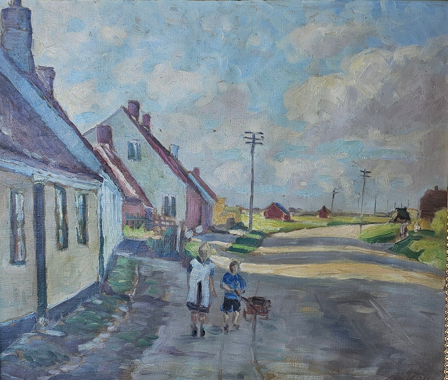 Oliemaleri på lærred monteret i guldramme med motiv af to børn på en landsbyvej