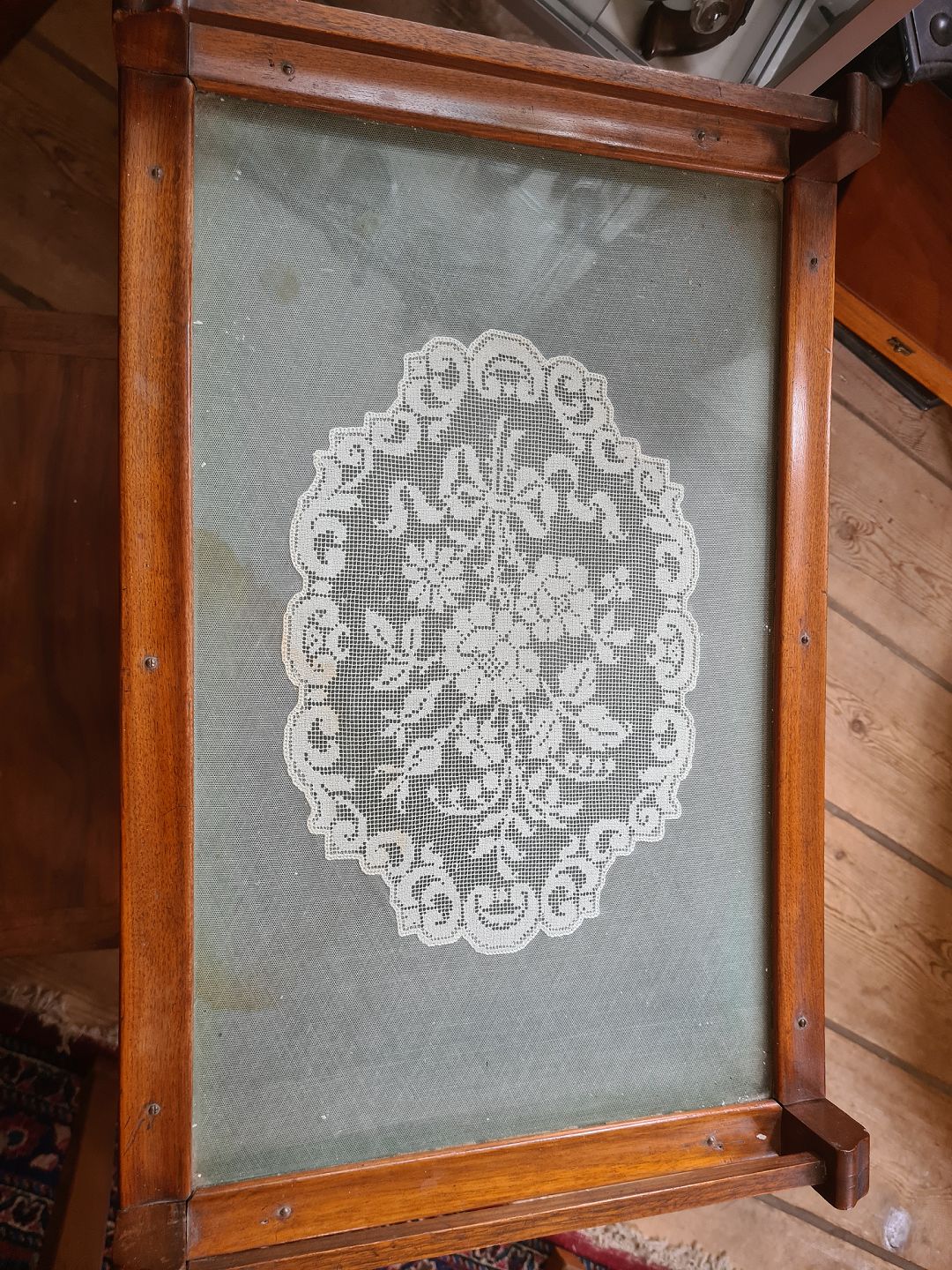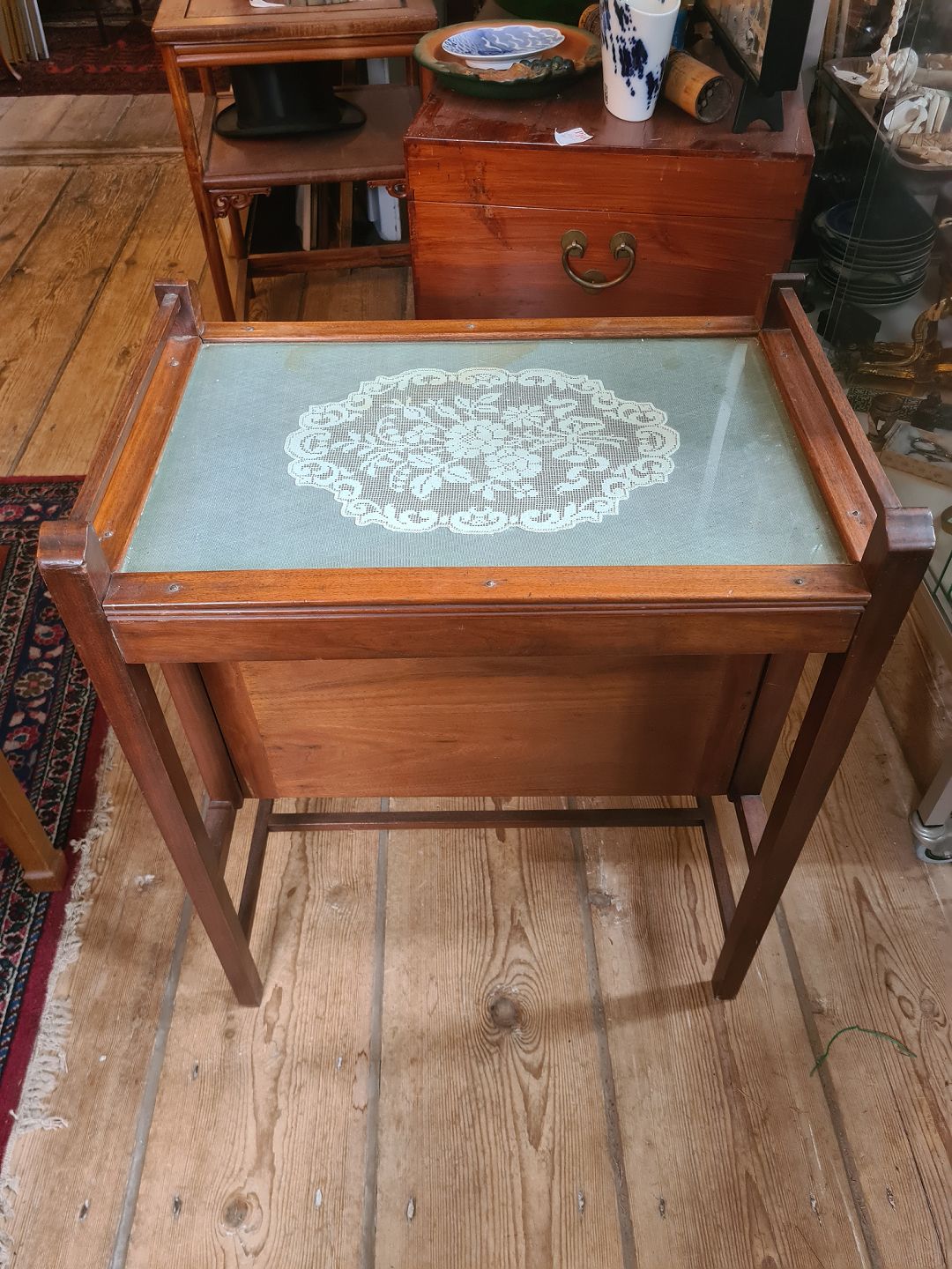 Lampebord fra 1930'erne i mahogni med glasplade og bar rum. Fremstår pænt velholdt og funktionsdygtigt, med kun en anelse brugsspor på broderiet under glaspladen.