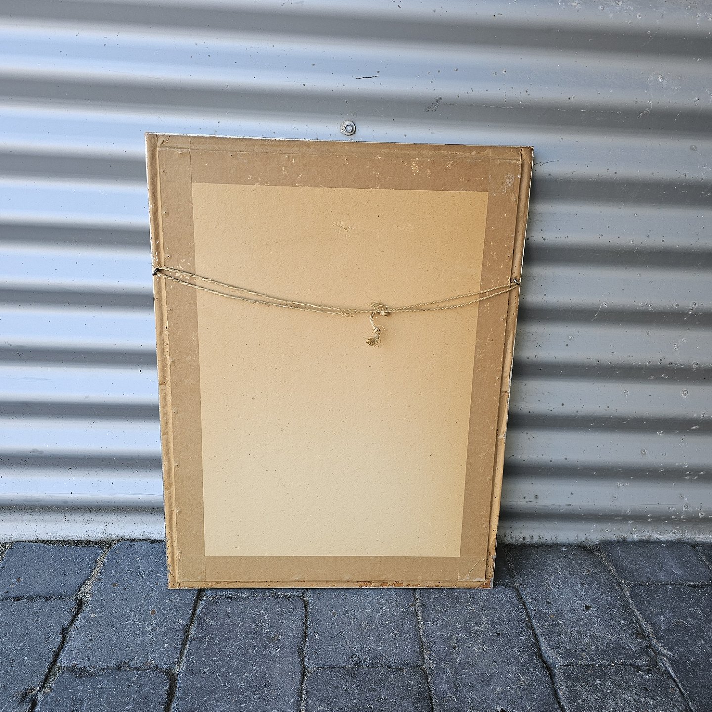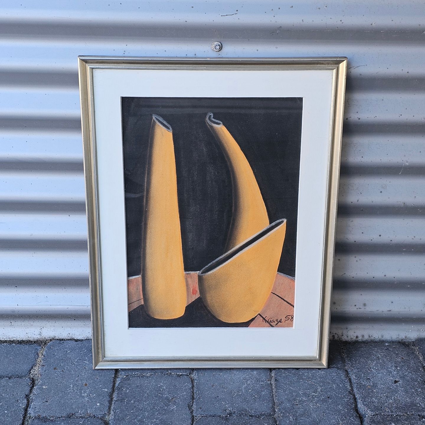 Tryk på papir monteret i hvid ramme med abstrakt motiv af gule former på sort baggrund