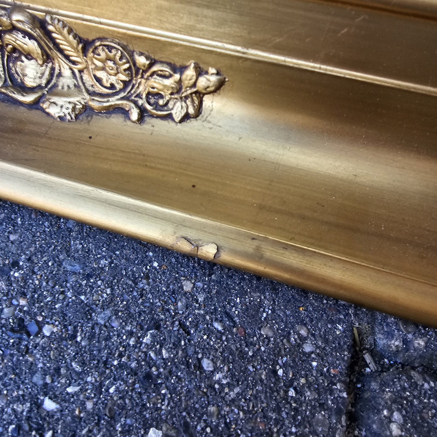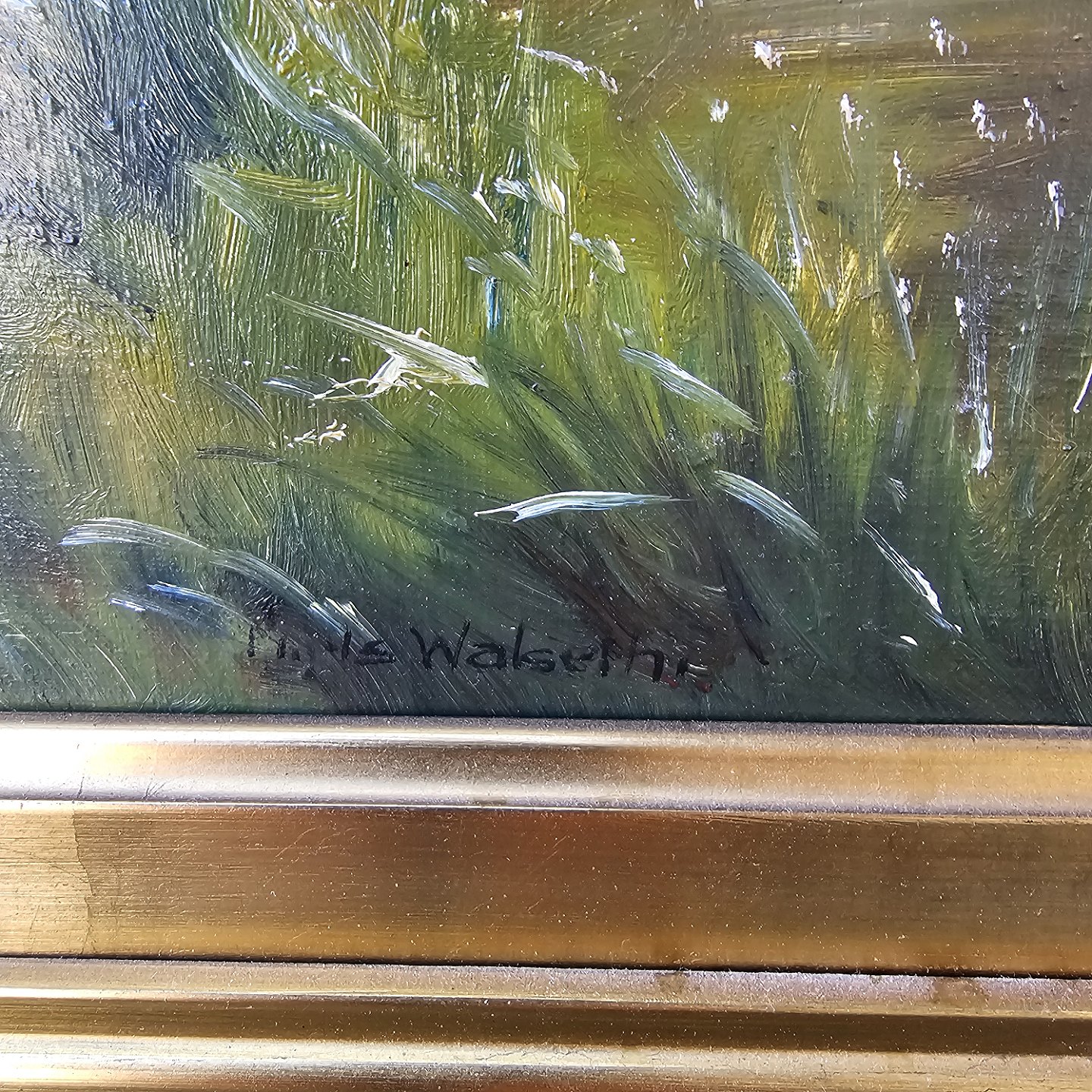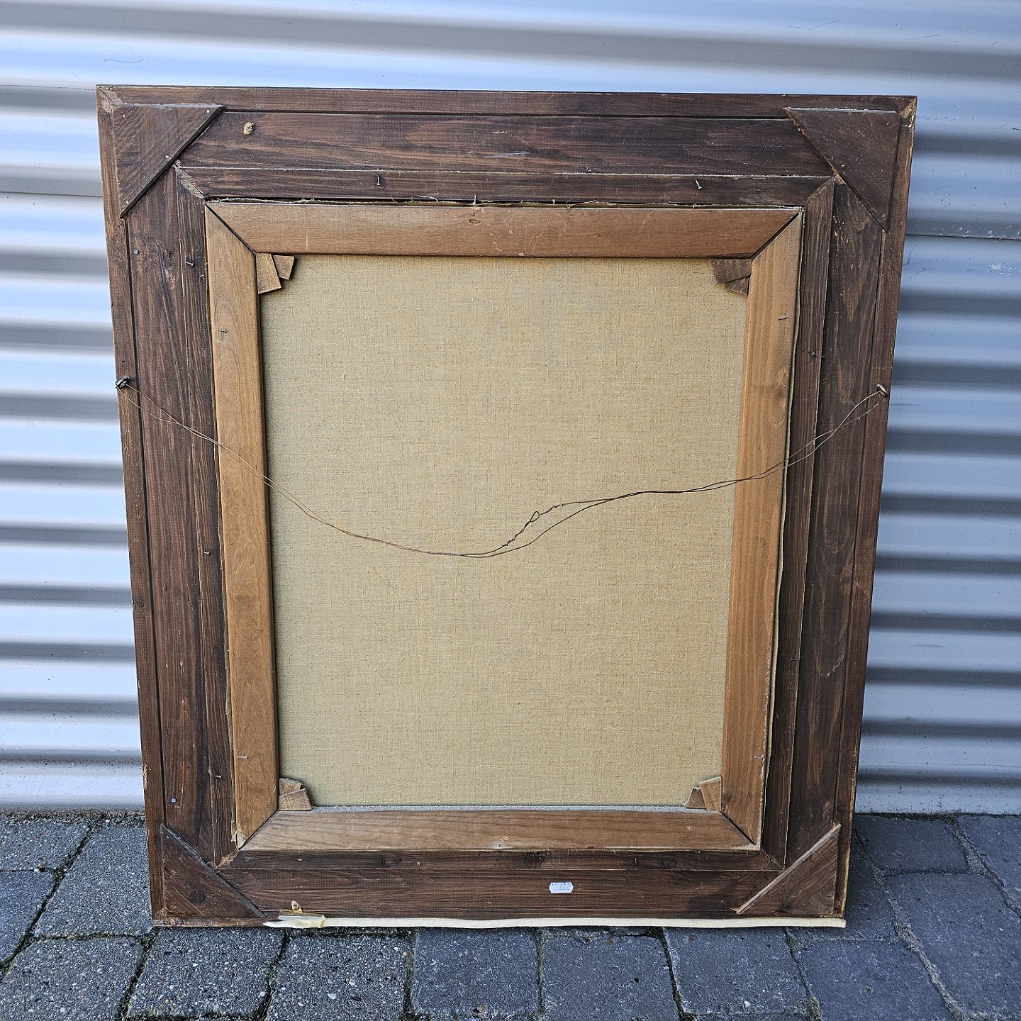 Oliemaleri på lærred i ornamenteret guldramme med motiv af en pige med gæs ved en gård