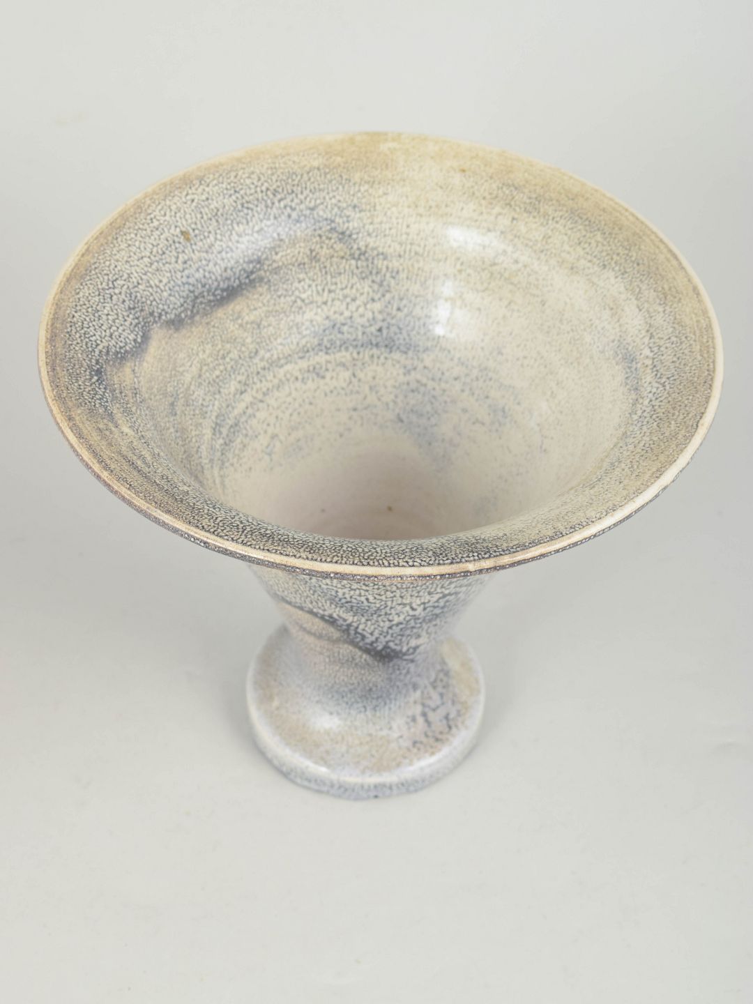 Dekorativ vase i stentøj med karakteristisk trompetform og dobbelt glasur i sorte og grå nuancer. Eksempel på Hammershøis sikre formsprog og subtile glasurarbejde fra 1930’erne. Stemplet i bunden.