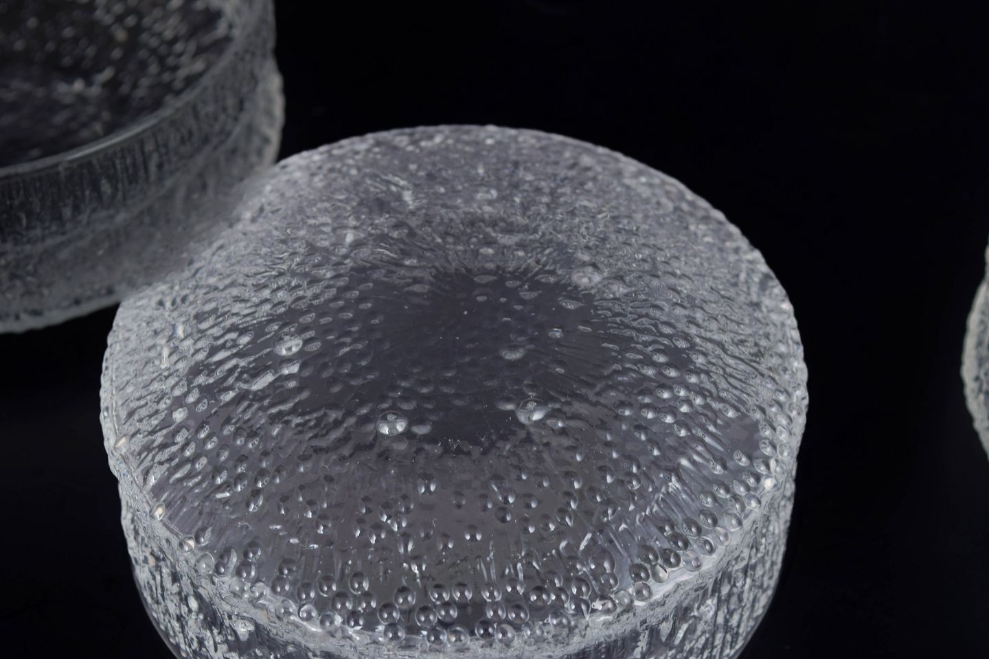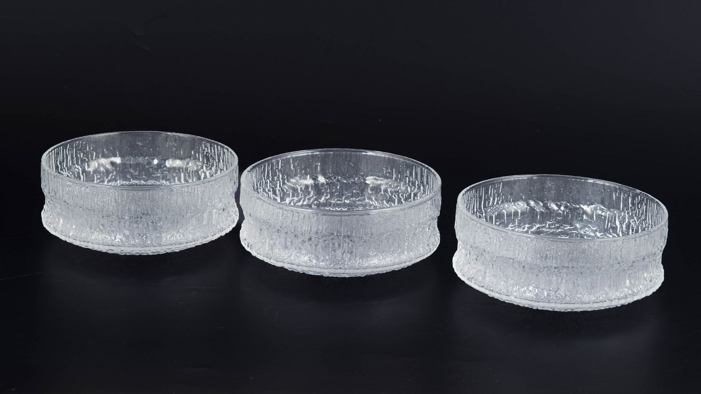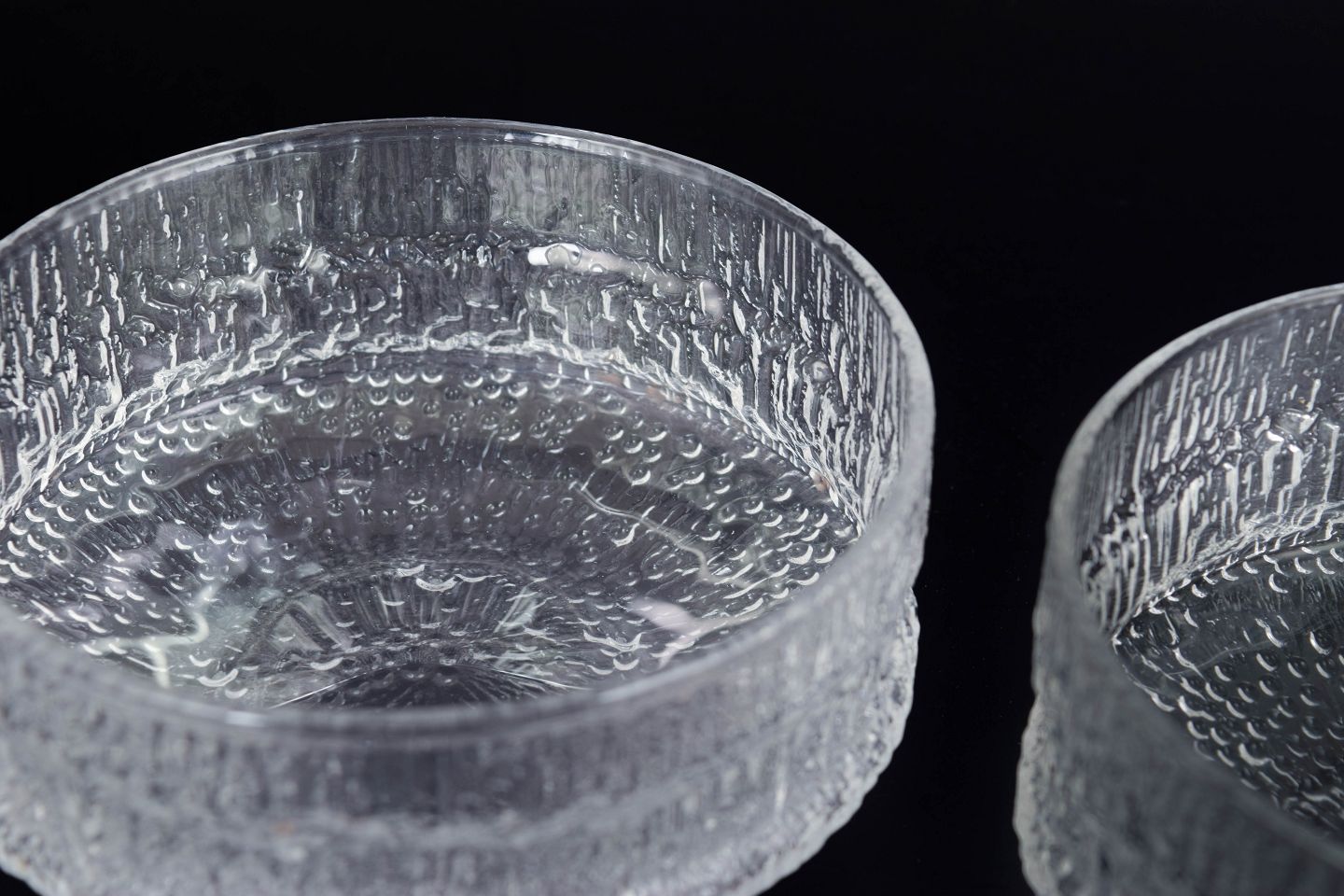 Sæt af tre mindre skåle i presset glas med karakteristisk organisk struktur og fint cirkulært reliefmønster. Designet skaber et smukt lysspil i glasset og er et klassisk eksempel på finsk glasdesign. Model Hopla i klart glas.