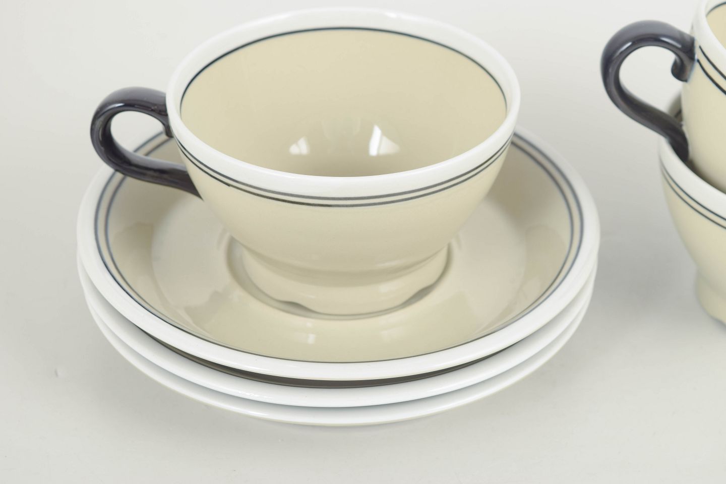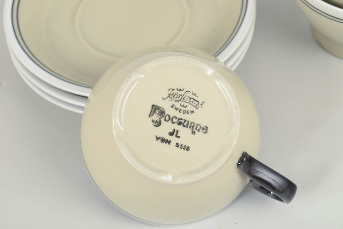 Elegante tekopper i fajance med tilhørende underkopper, udført i et enkelt og raffineret formsprog med lys glasur. “Nocturne”-serien afspejler Rörstrands funktionelle og tidløse designtradition fra 1960’erne.