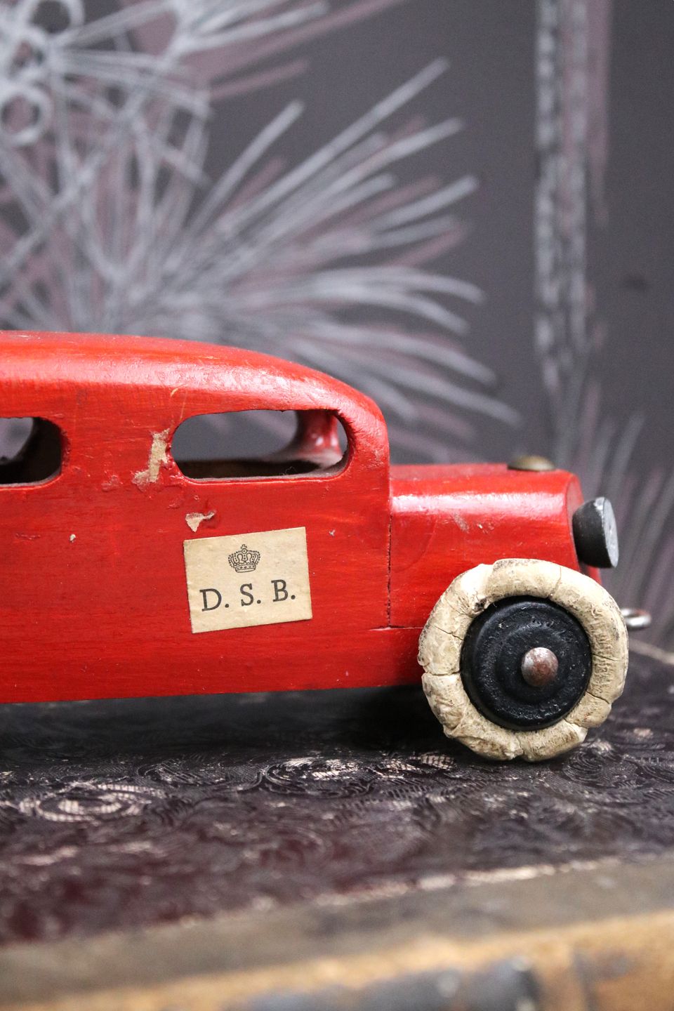 Dekorativ, gammel vintage rutebil i rødmalet træ med DSB skilt på døren og en fin gammel patina. H: 6,5cm. L: 22,5cm.