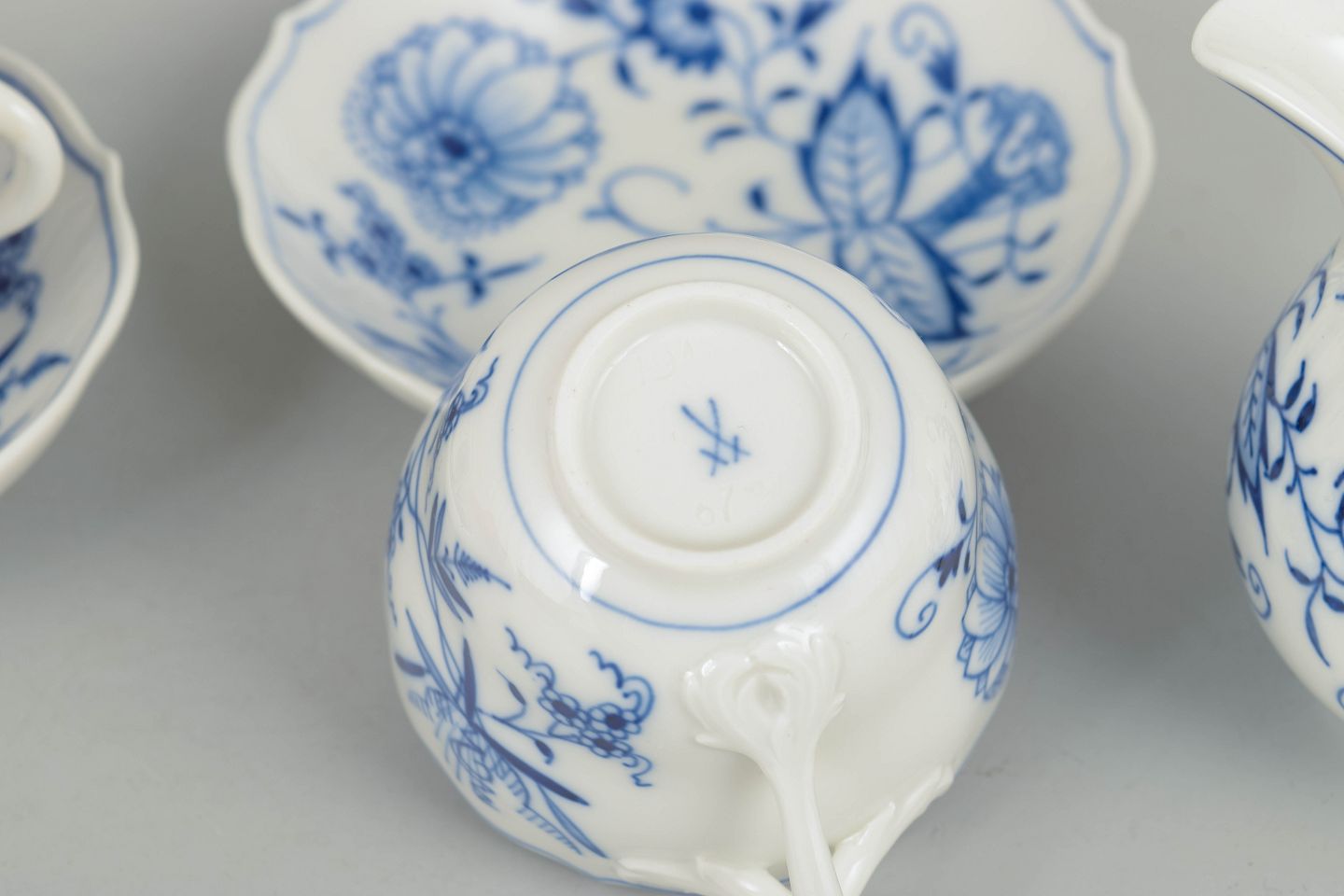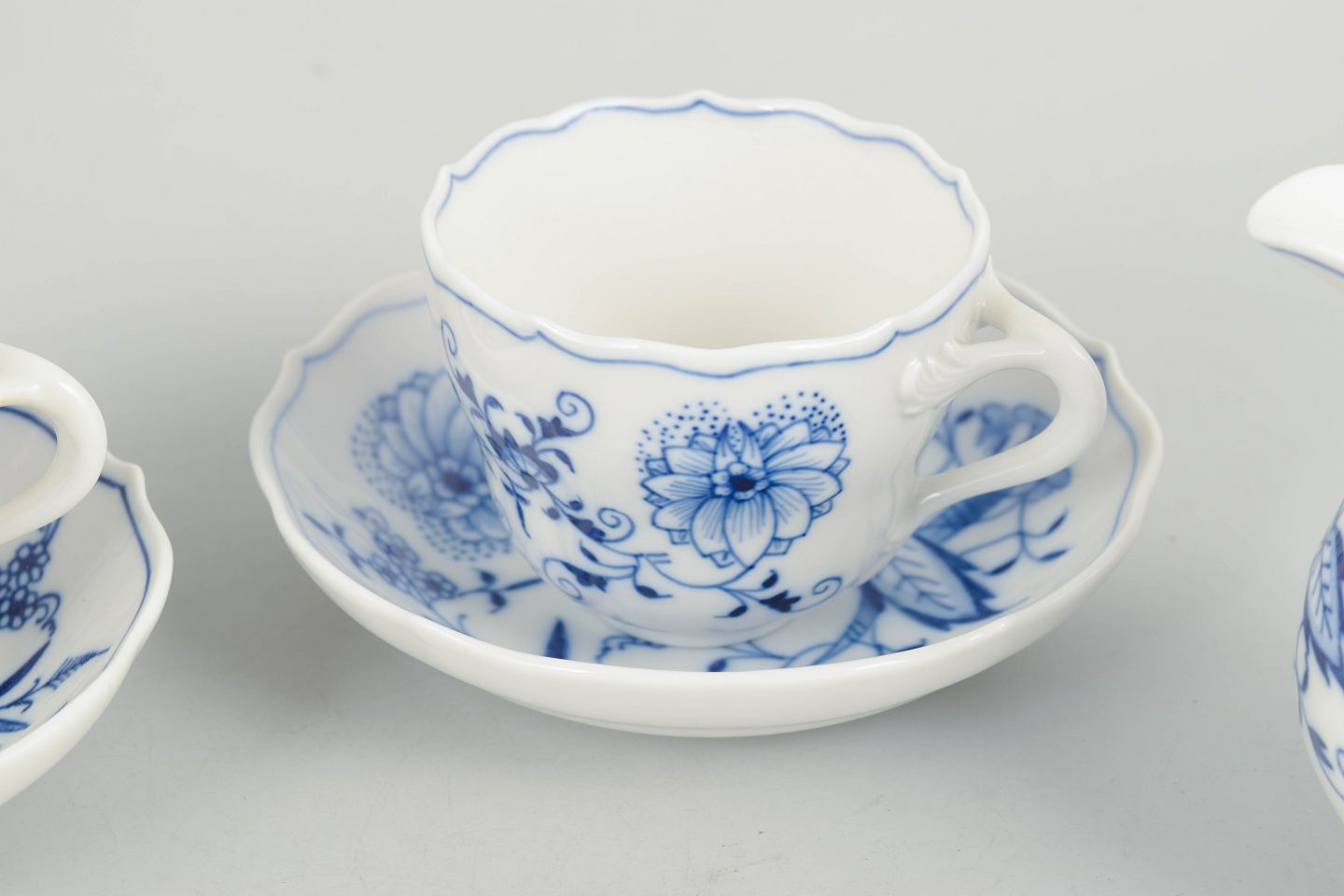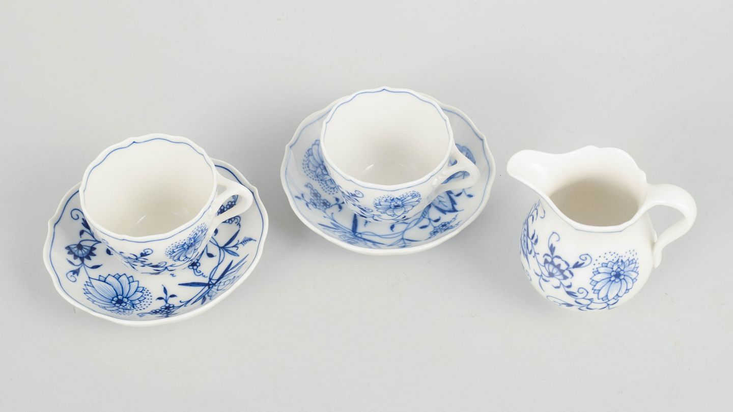Sæt bestående af to espressokopper med tilhørende underkopper samt flødekande i porcelæn med håndmalet blå dekoration i det klassiske løgmønster. Fremstillet hos Meissen i midten af 1900-tallet og markeret med Meissen krydssværd. Første og tredje sortering.